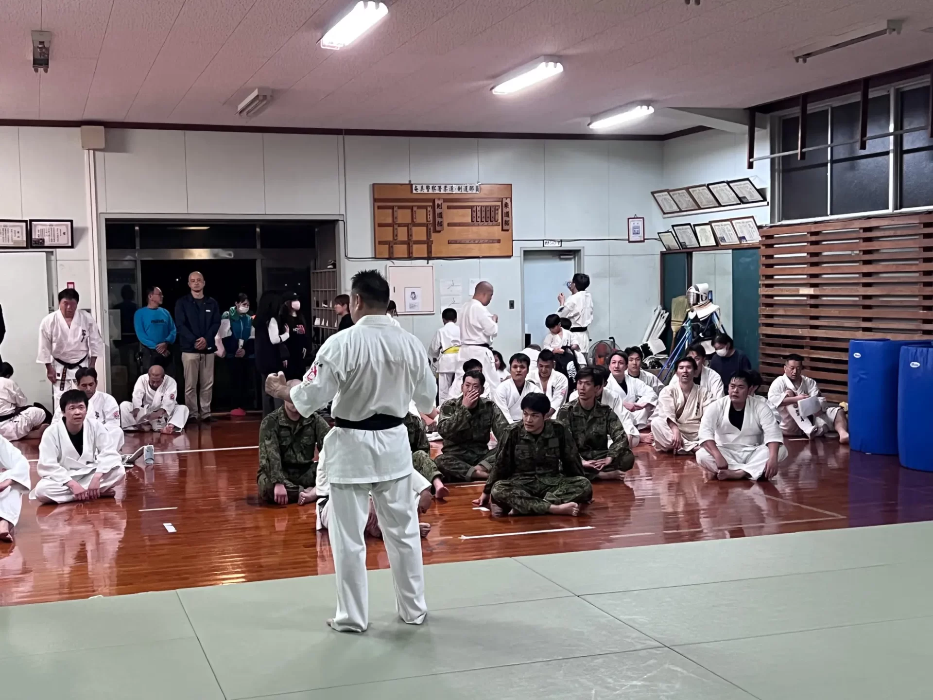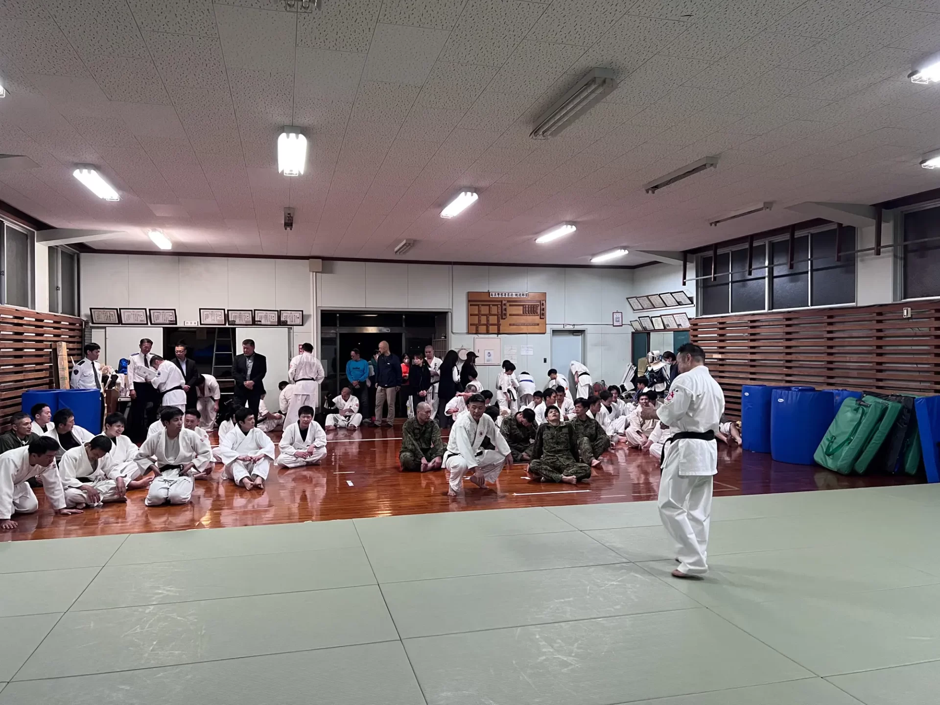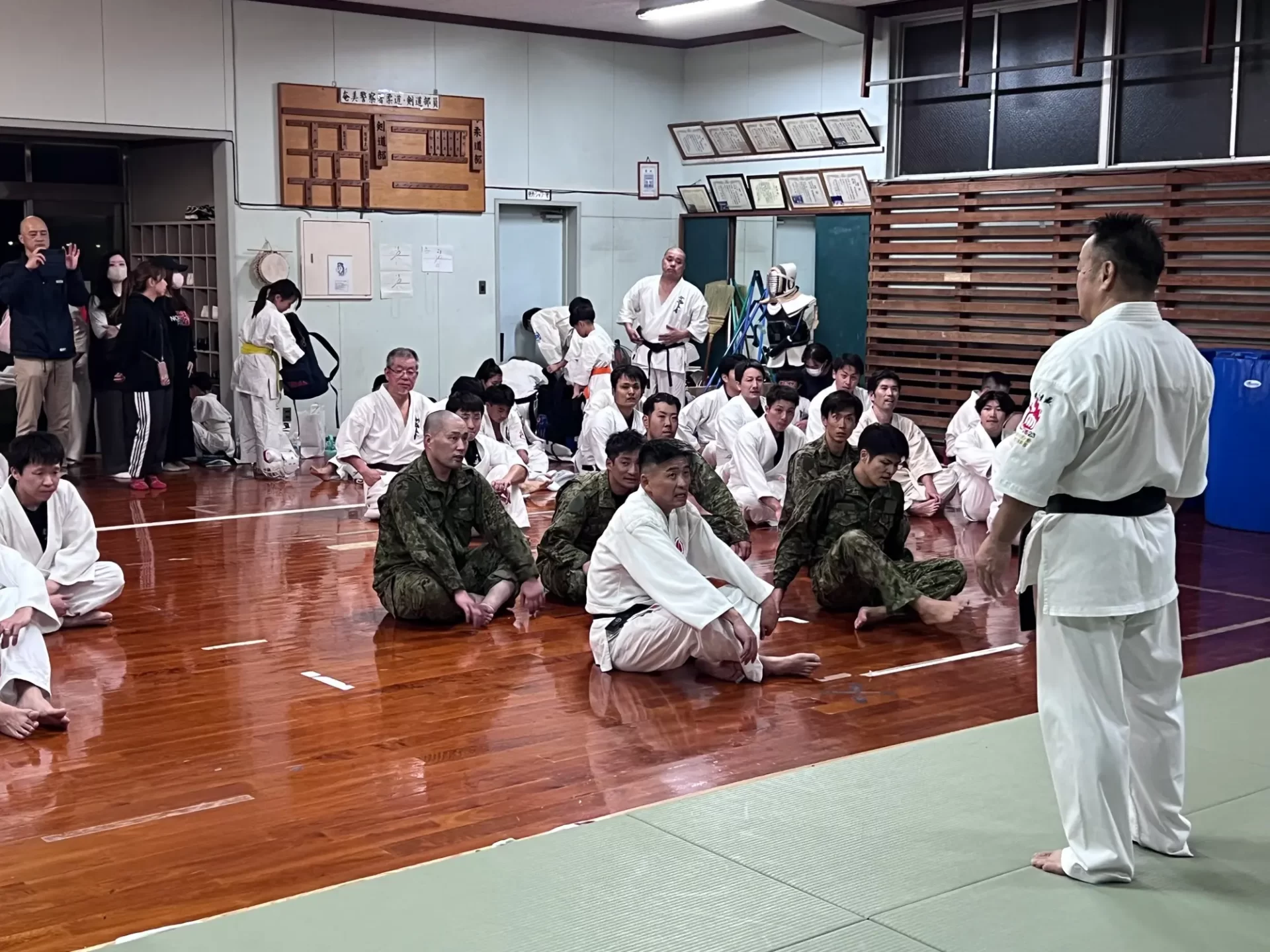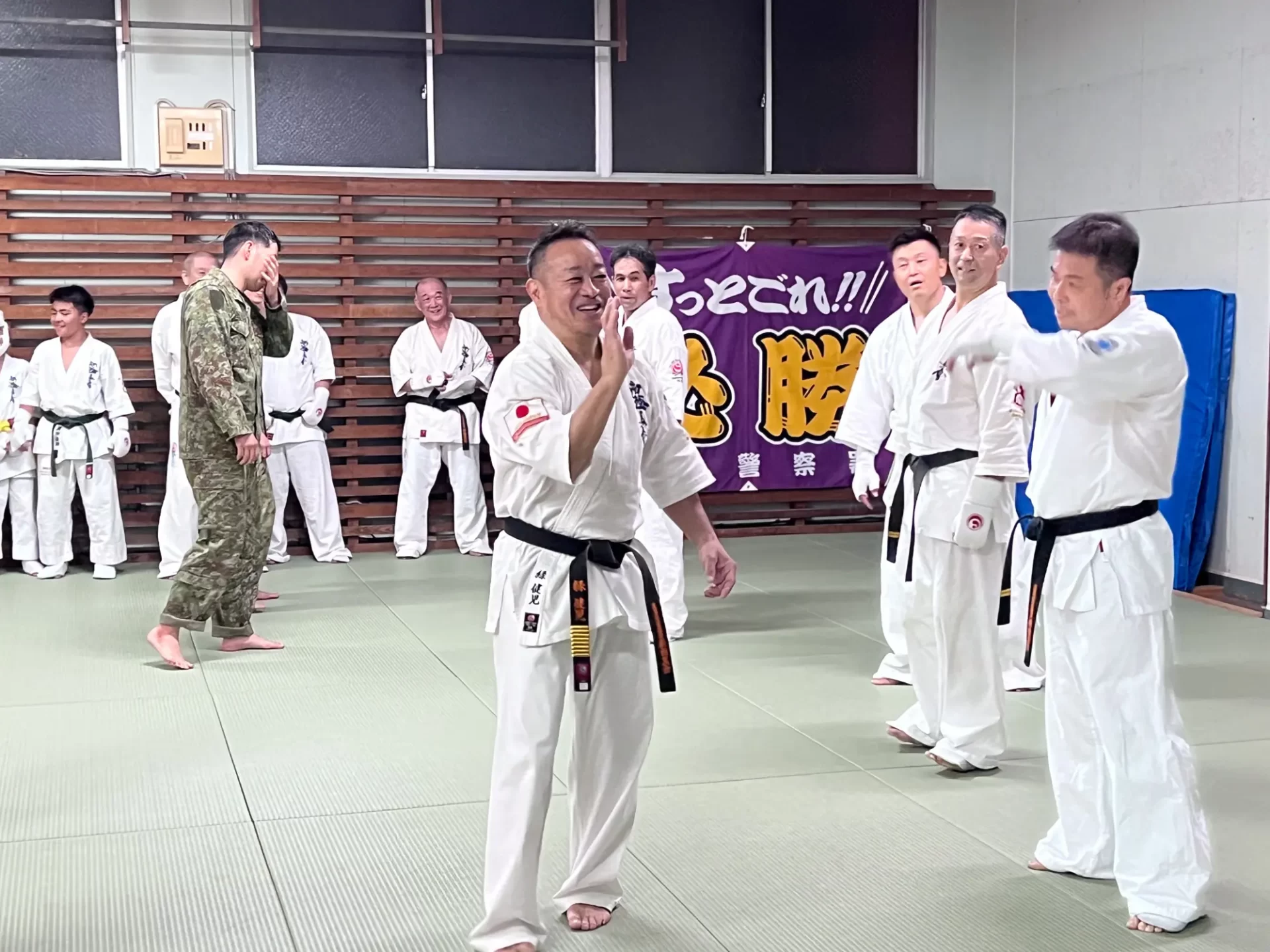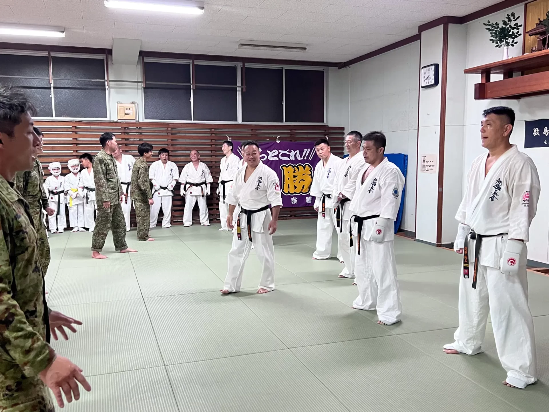 道場生にとって普段触れあうことのない警察署員、陸上自衛隊員、海上保安部 職員との交流が行われるとともに、子供たちの声の大きさや元気良い立ち振る 舞い、シニア道場生の歳を感じさせない動き、そして道場生全体のスタミナに驚きを隠せない職員の顔が印象的でした。
