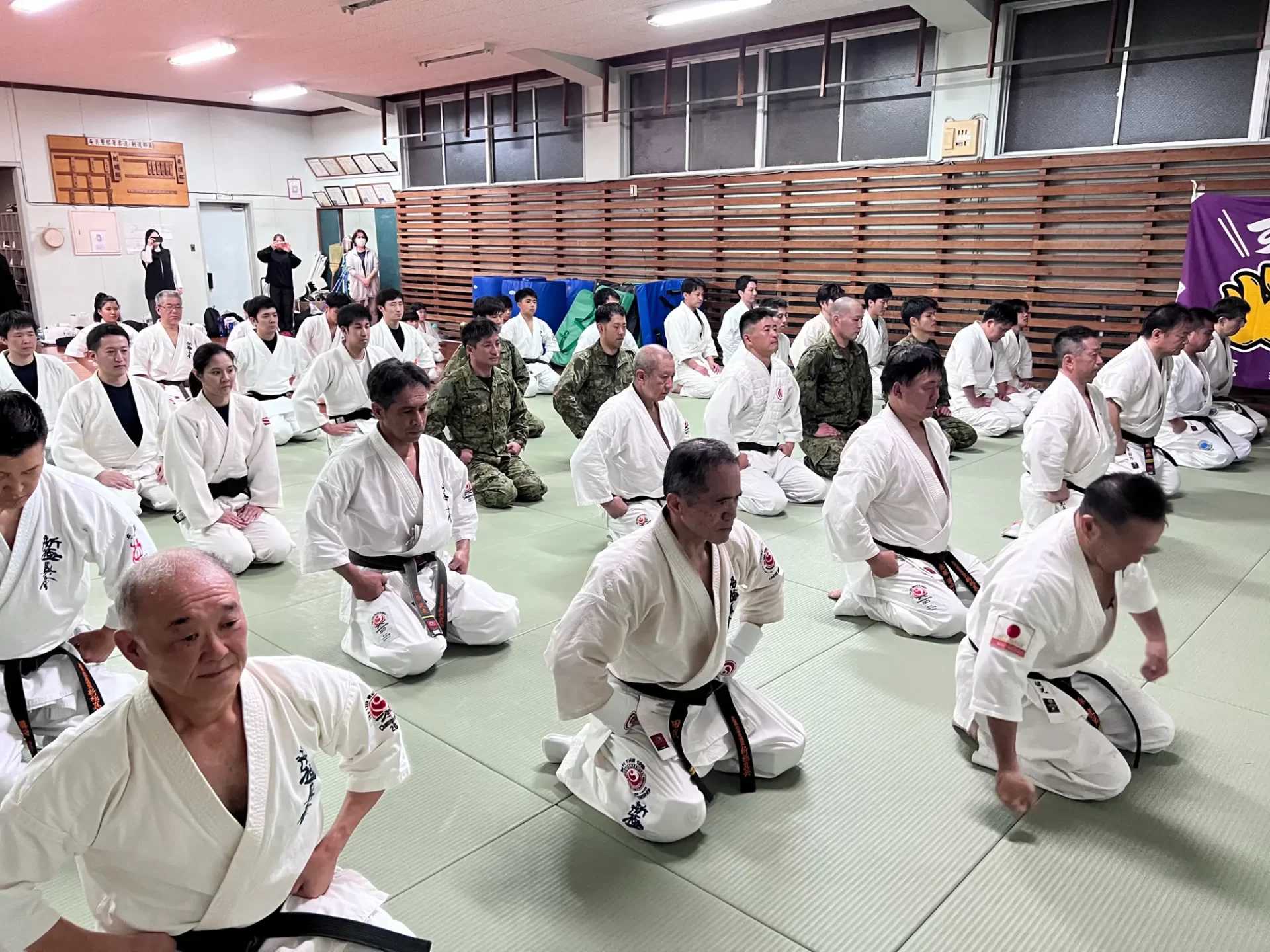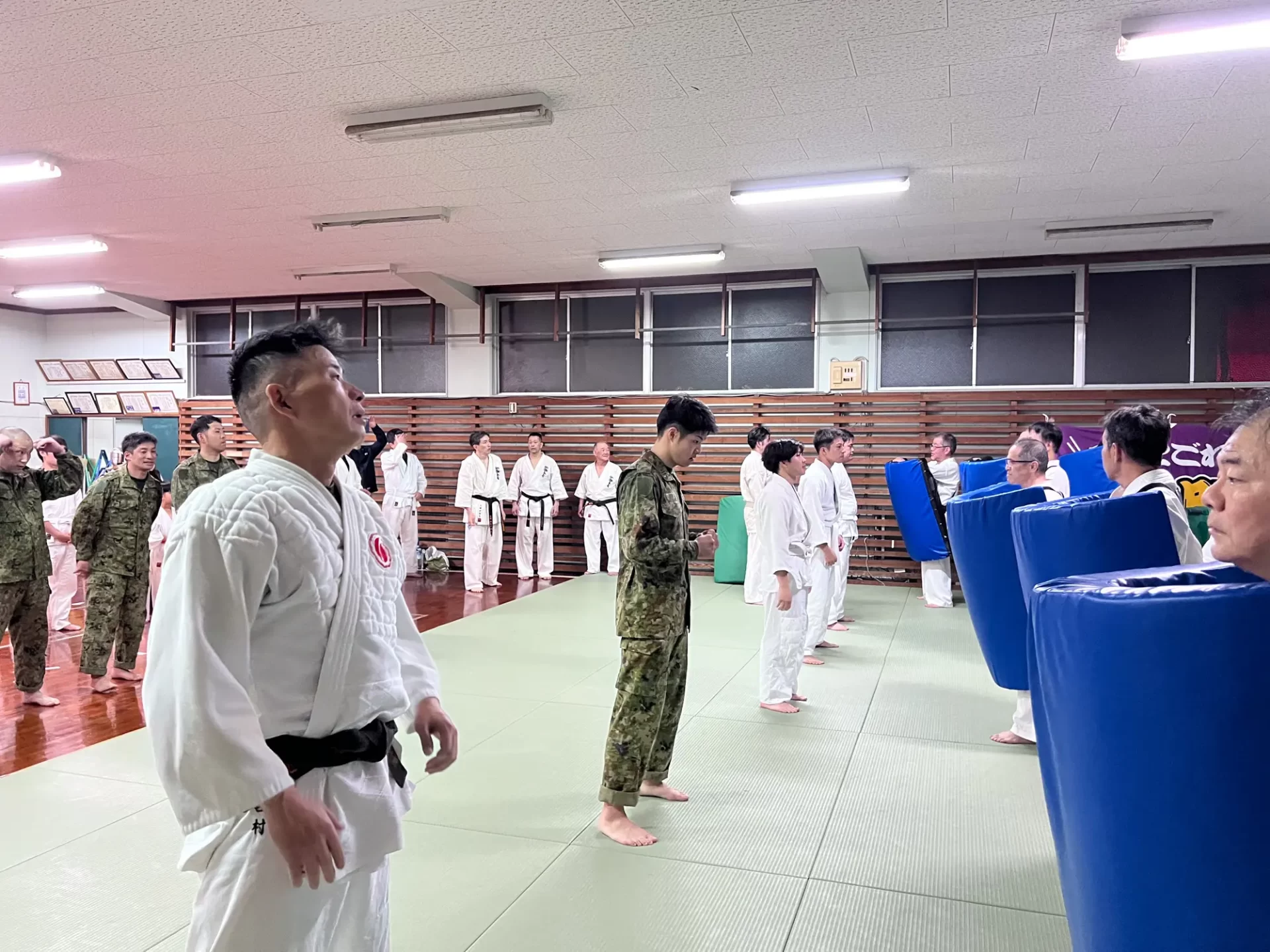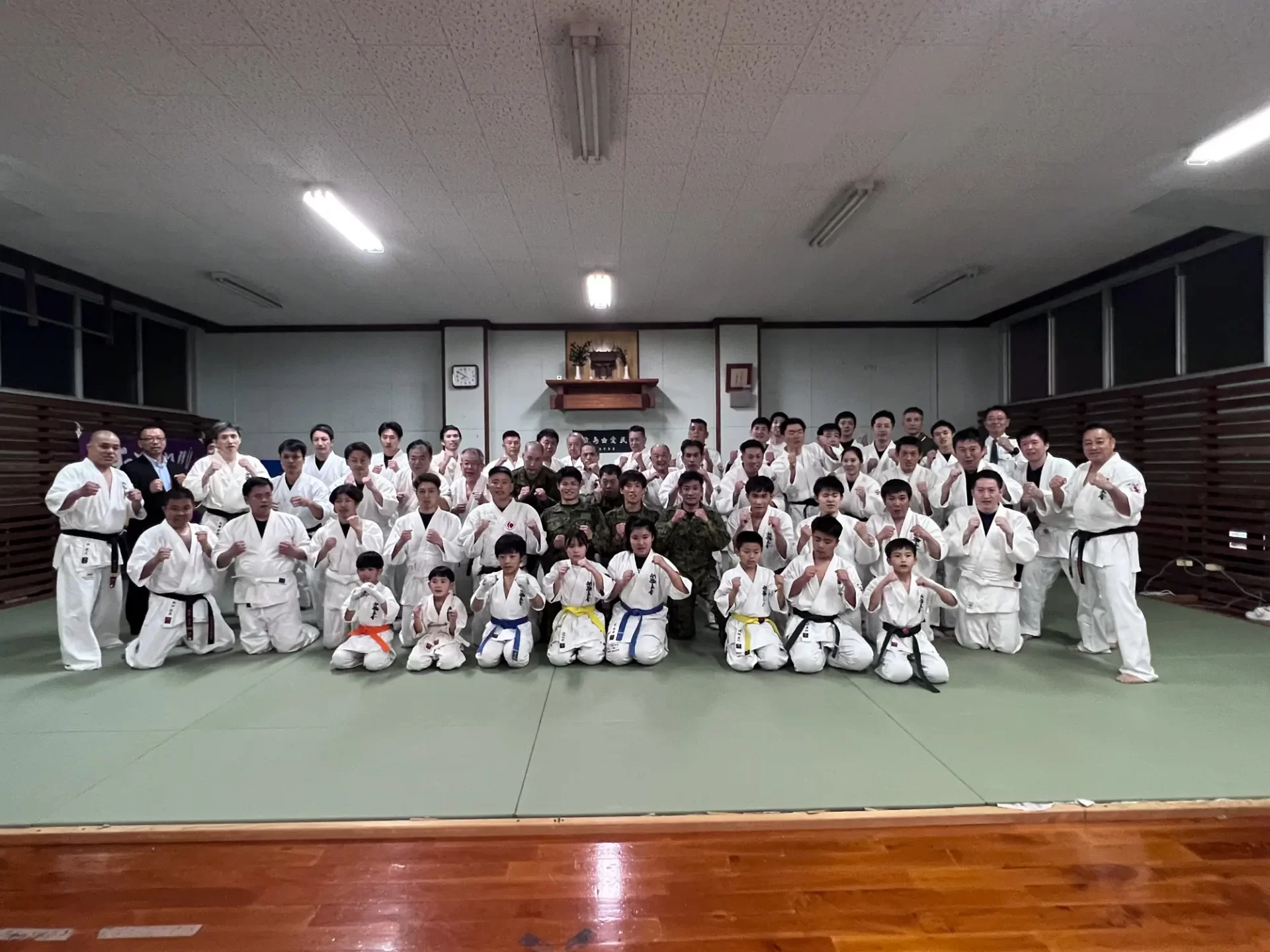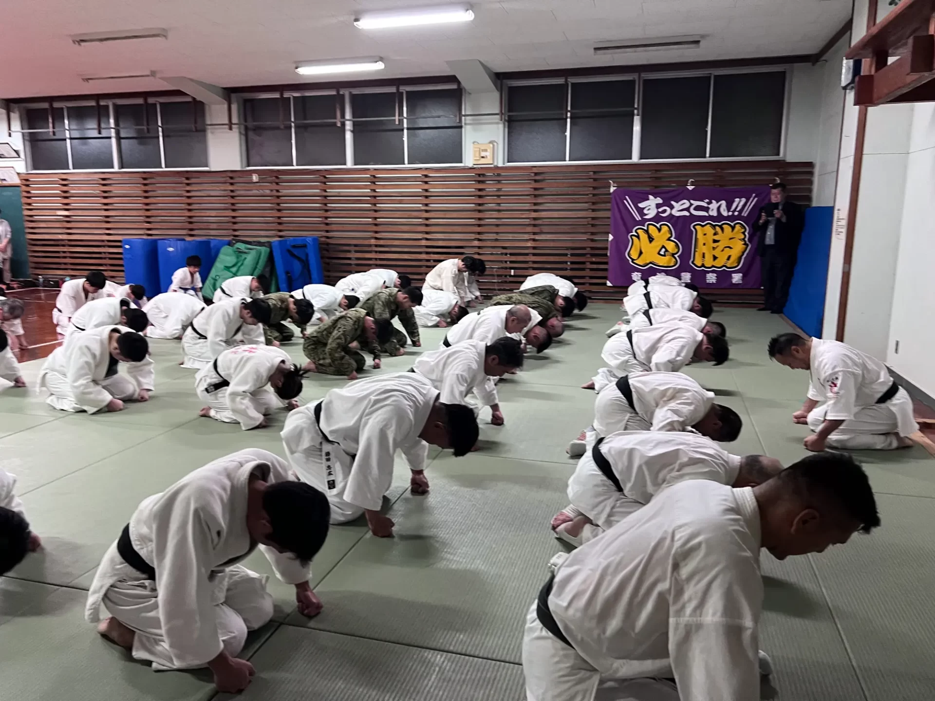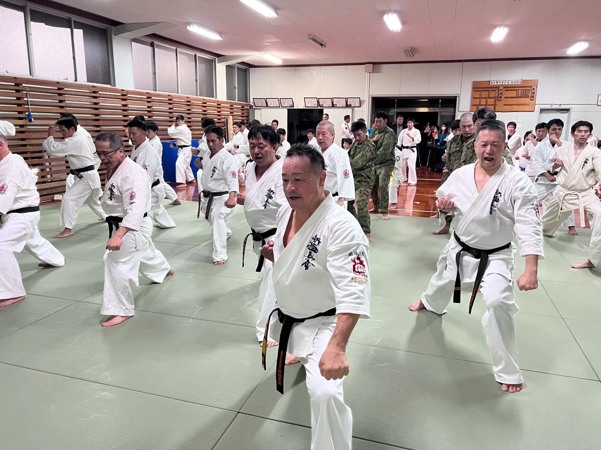 道場生にとって普段触れあうことのない警察署員、陸上自衛隊員、海上保安部 職員との交流が行われるとともに、子供たちの声の大きさや元気良い立ち振る 舞い、シニア道場生の歳を感じさせない動き、そして道場生全体のスタミナに驚きを隠せない職員の顔が印象的でした。