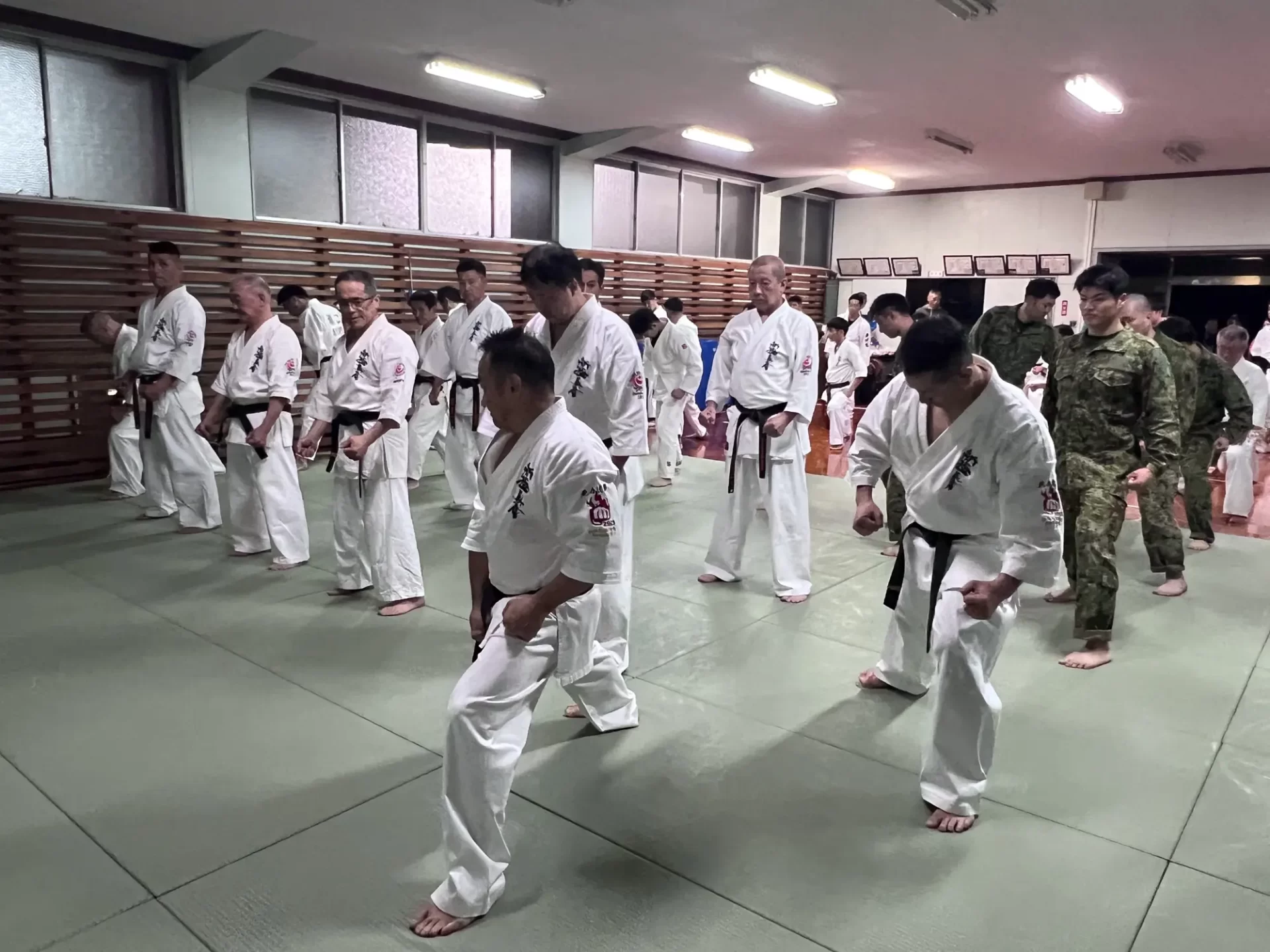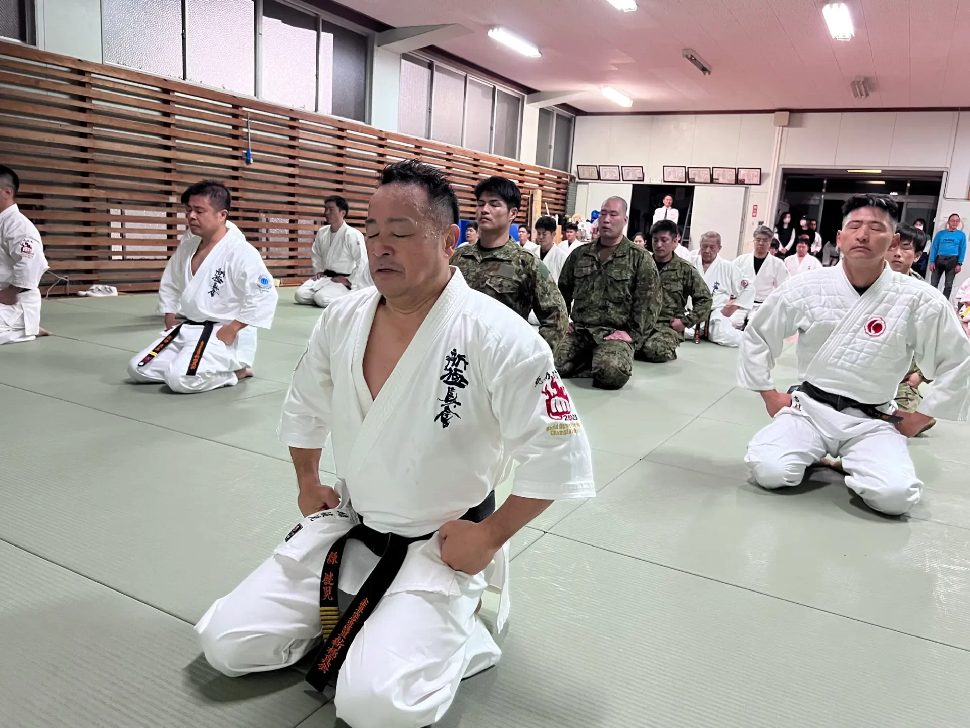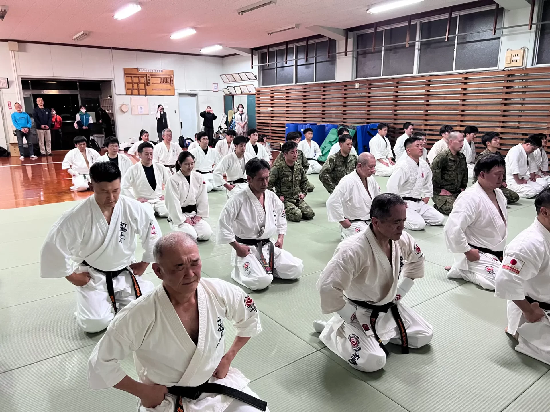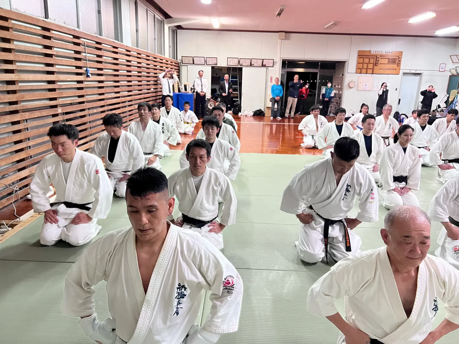 道場生にとって普段触れあうことのない警察署員、陸上自衛隊員、海上保安部 職員との交流が行われるとともに、子供たちの声の大きさや元気良い立ち振る 舞い、シニア道場生の歳を感じさせない動き、そして道場生全体のスタミナに驚きを隠せない職員の顔が印象的でした。