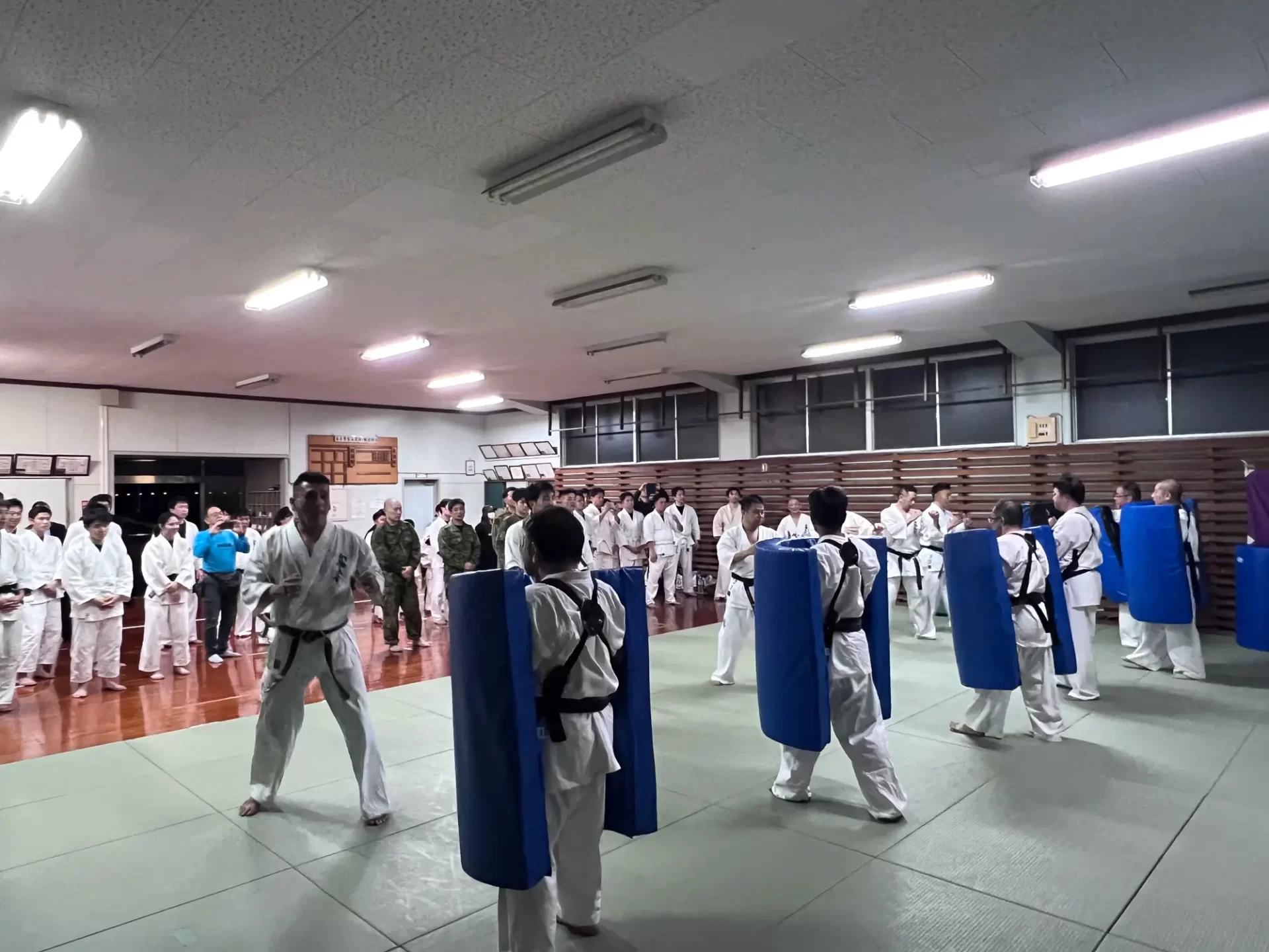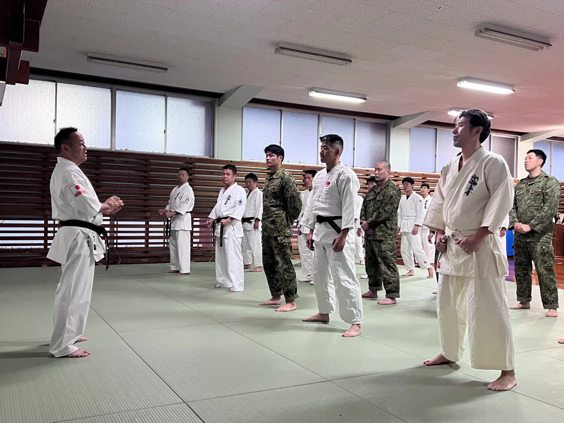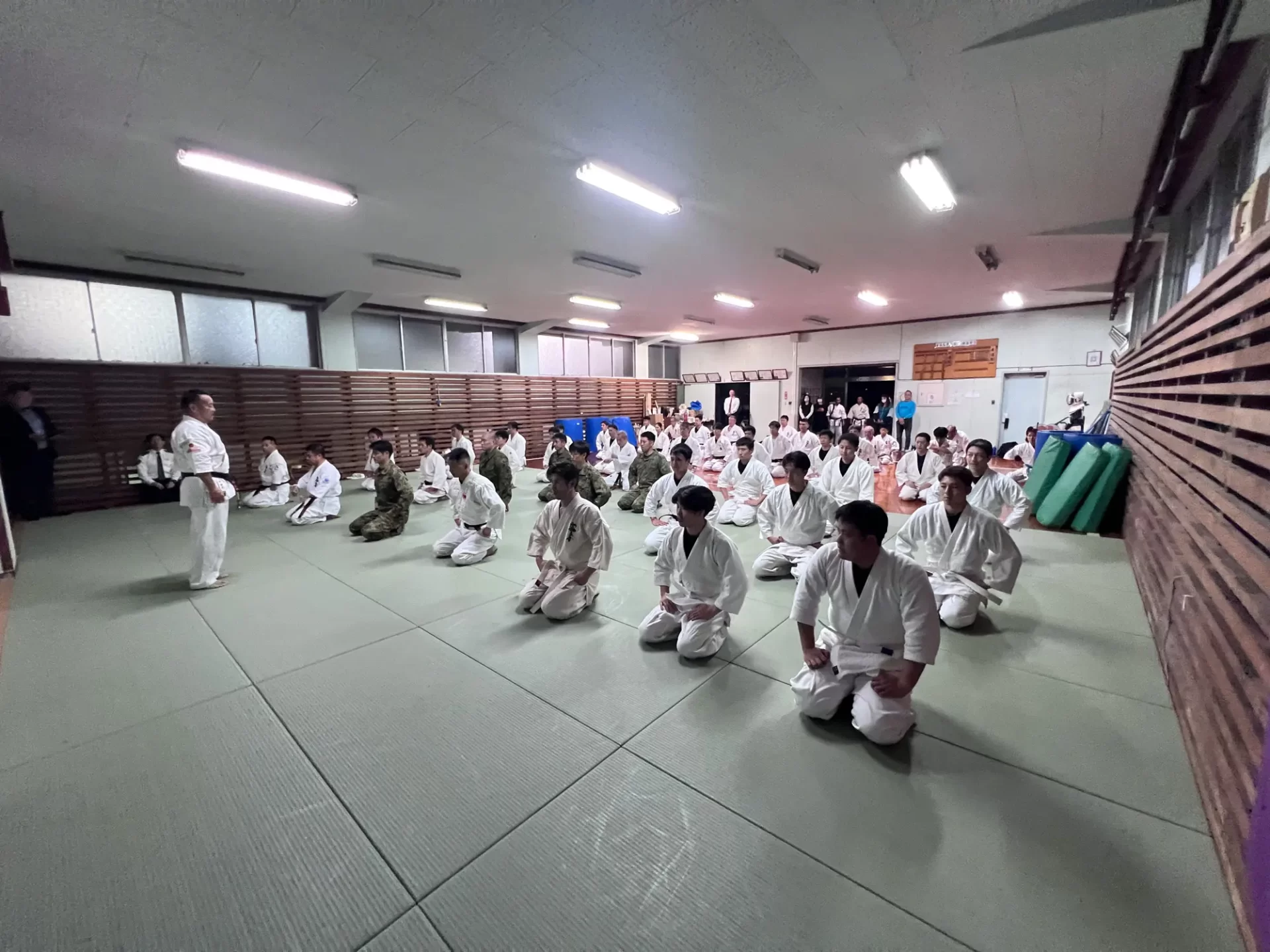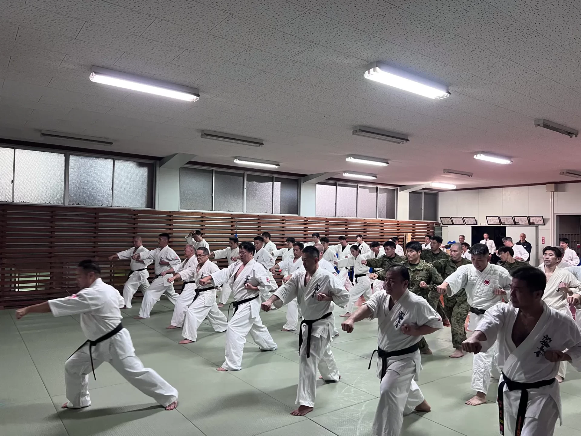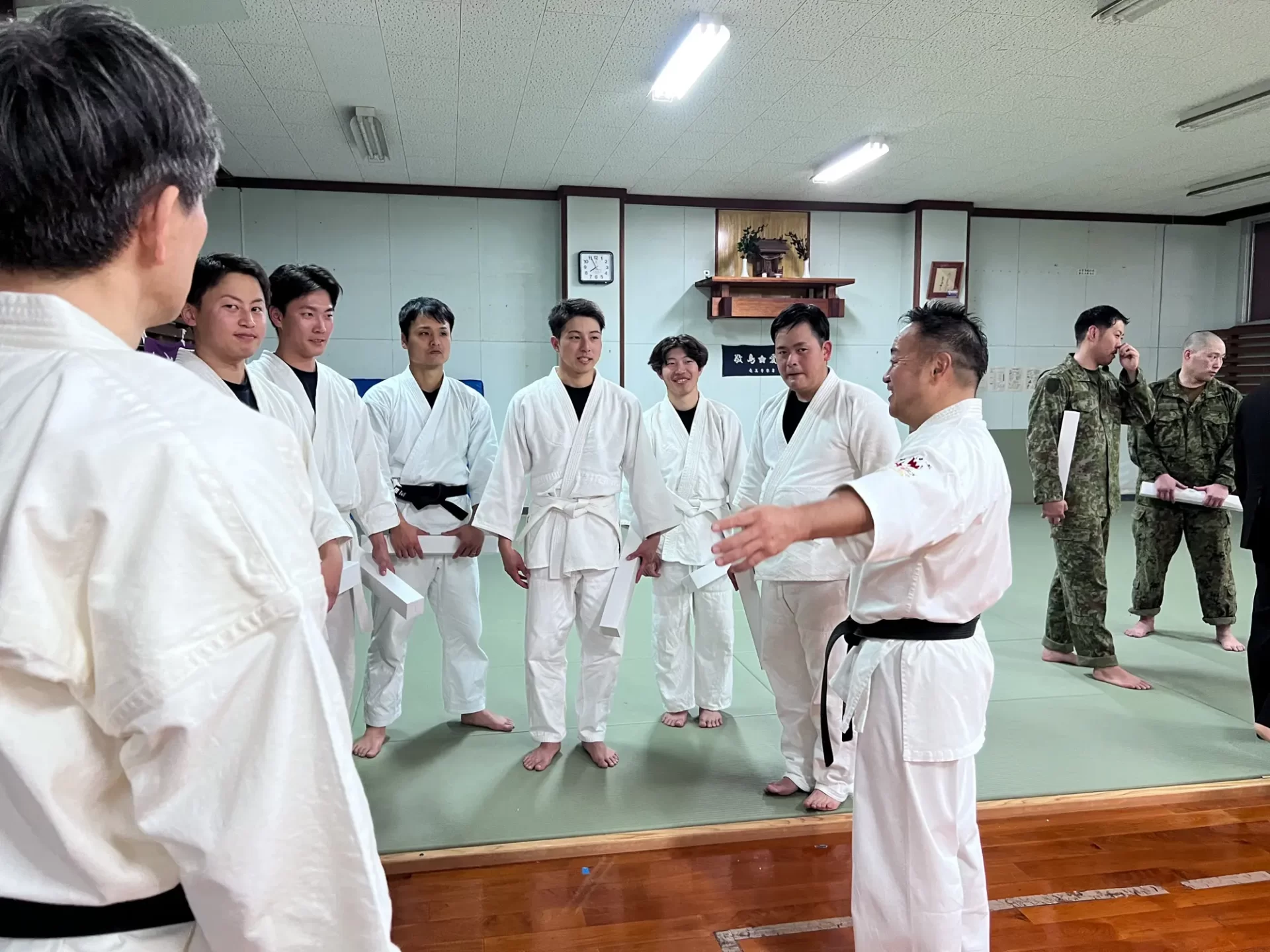 道場生にとって普段触れあうことのない警察署員、陸上自衛隊員、海上保安部 職員との交流が行われるとともに、子供たちの声の大きさや元気良い立ち振る 舞い、シニア道場生の歳を感じさせない動き、そして道場生全体のスタミナに驚きを隠せない職員の顔が印象的でした。