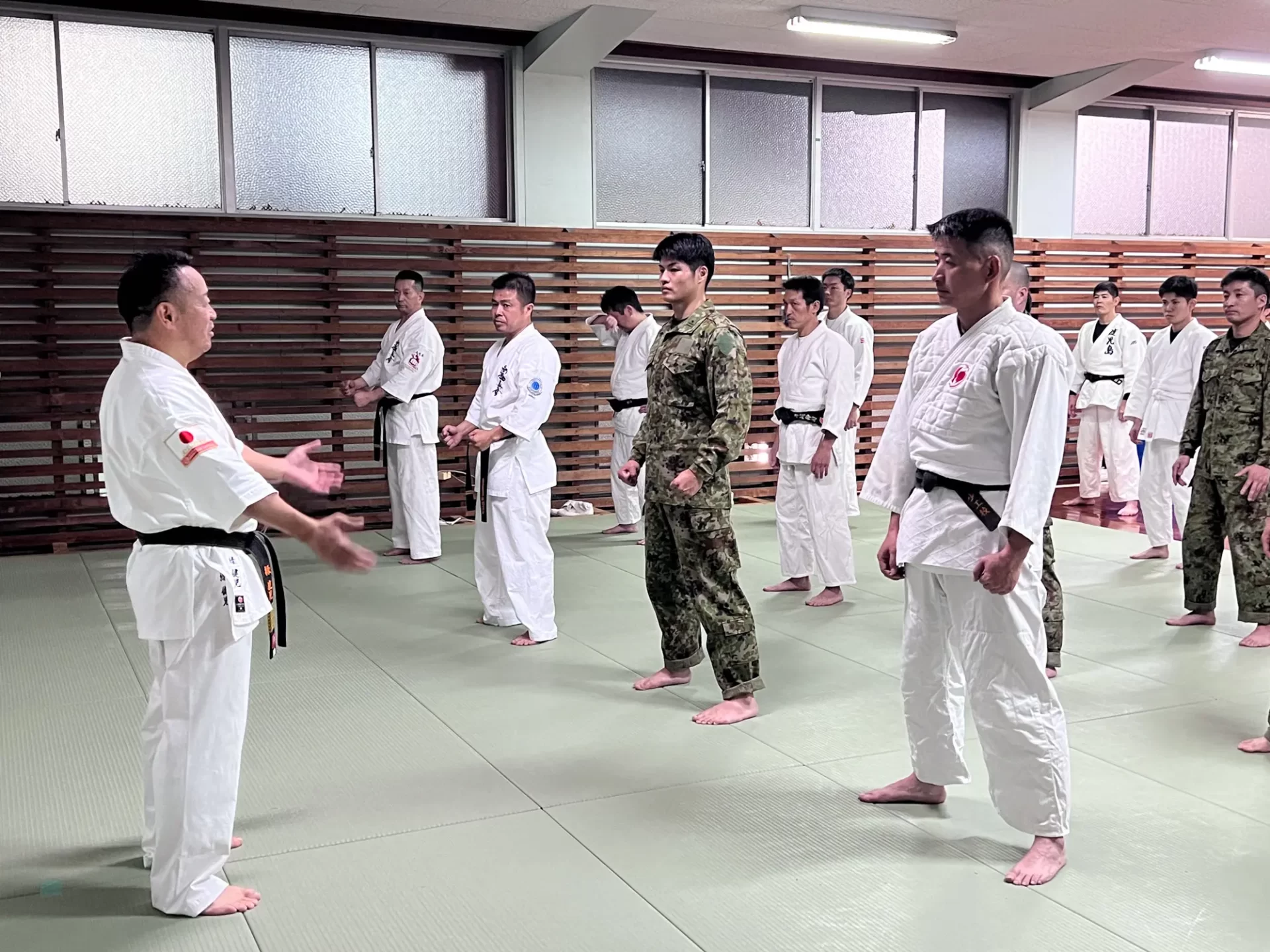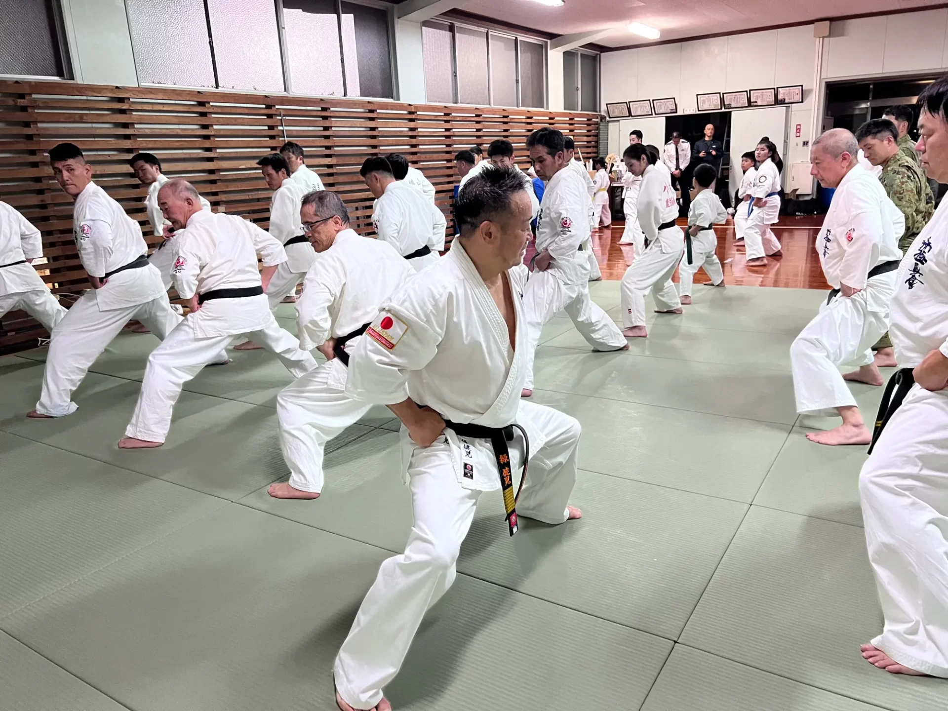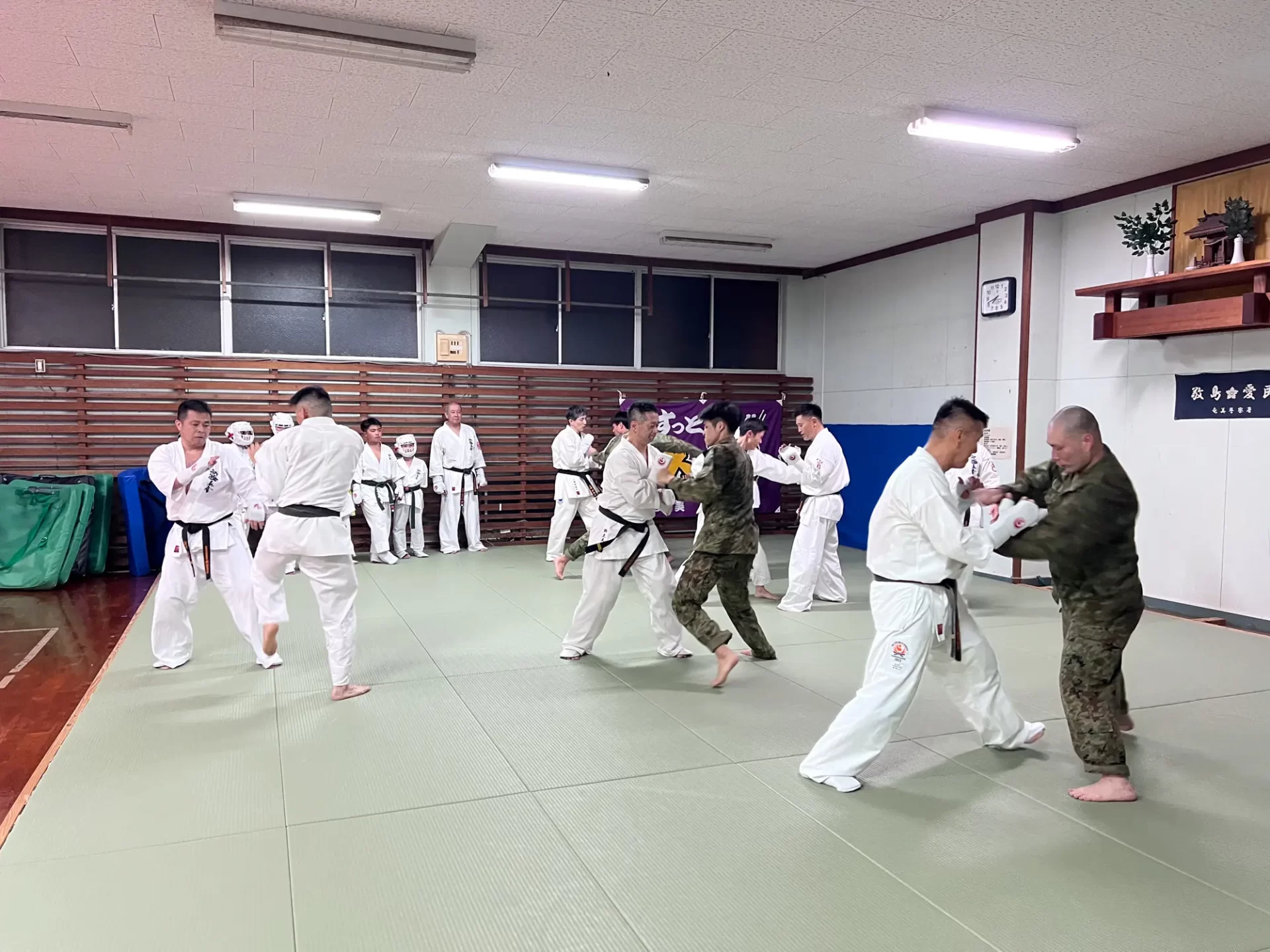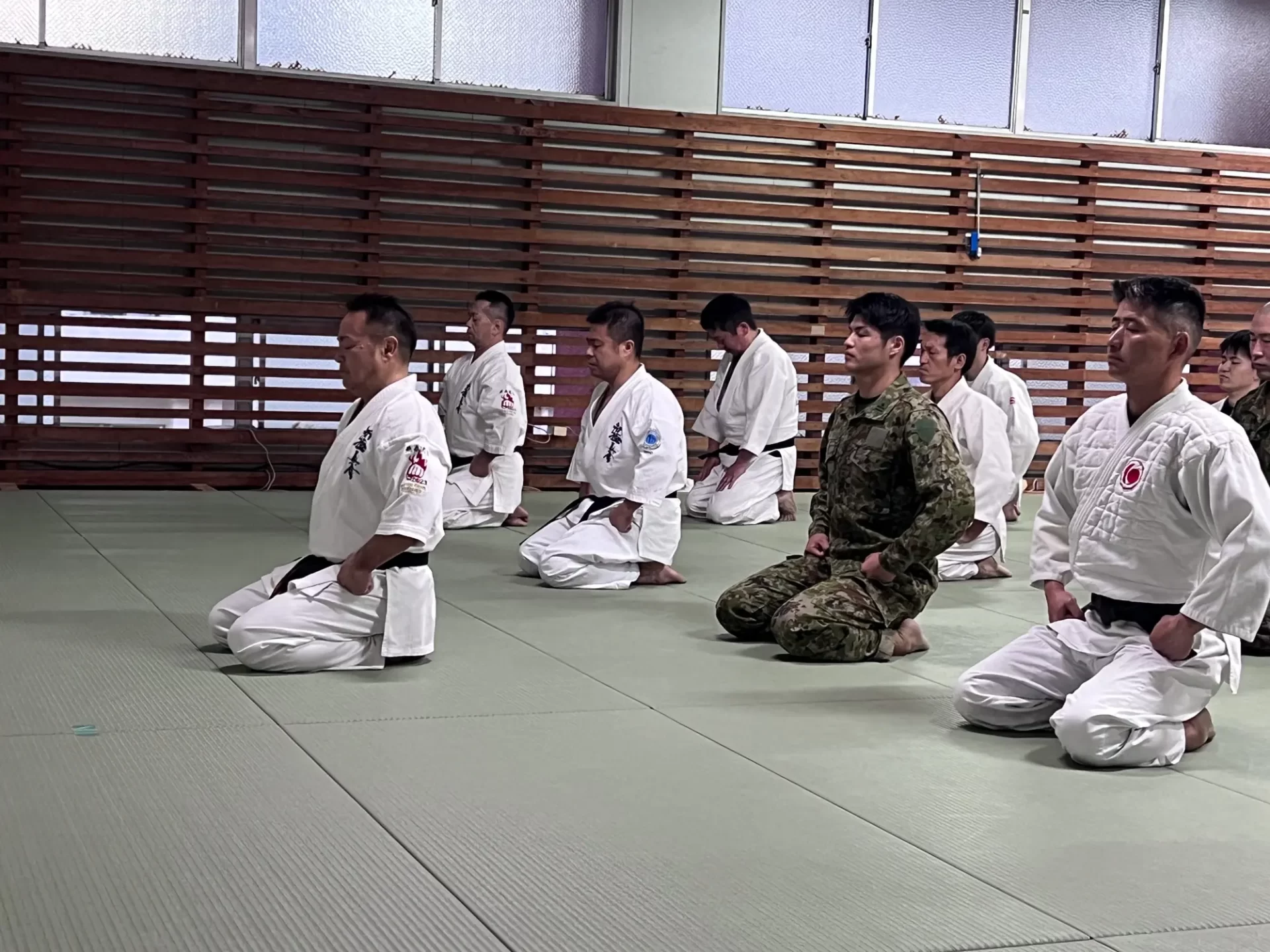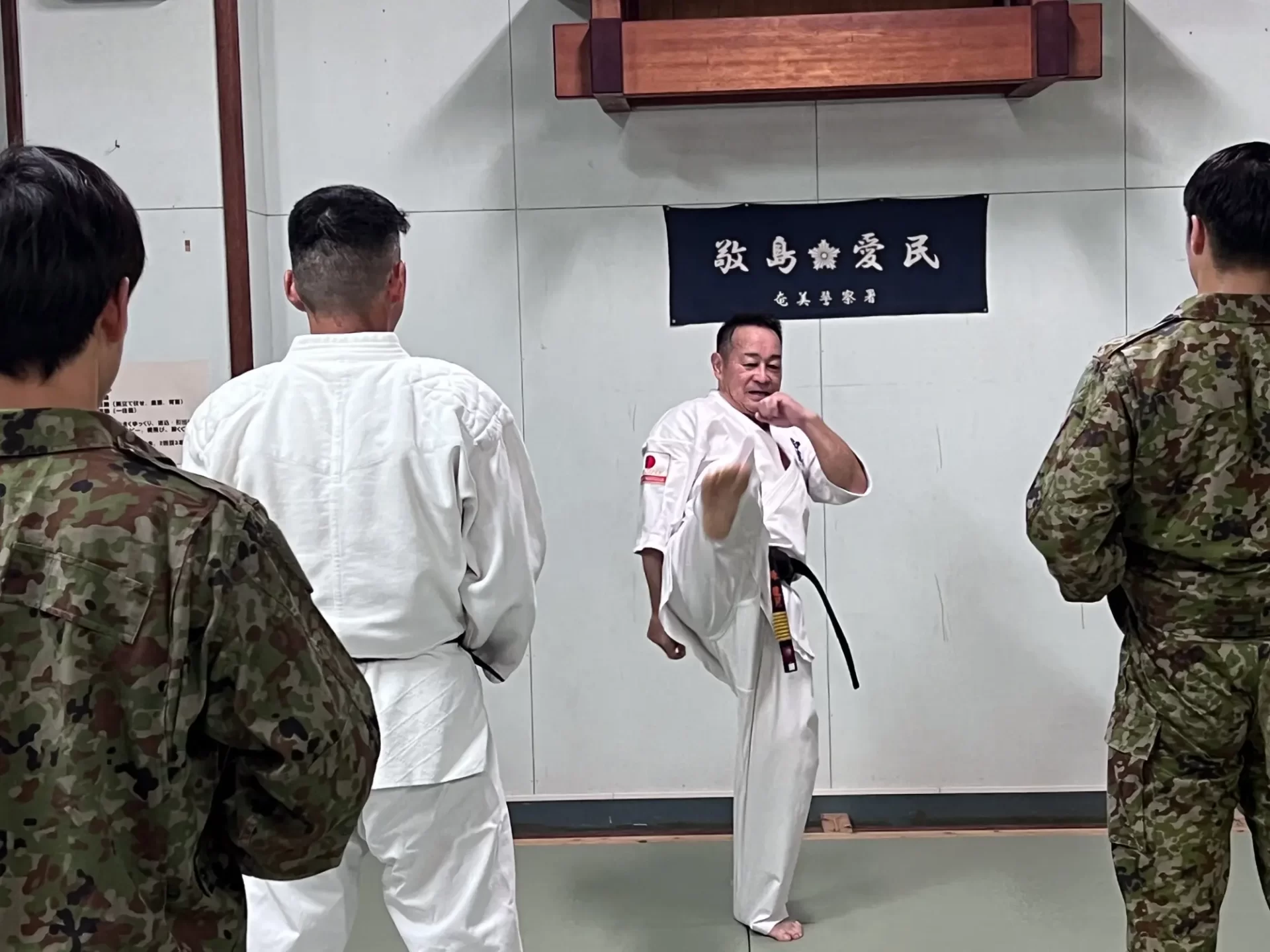 道場生にとって普段触れあうことのない警察署員、陸上自衛隊員、海上保安部 職員との交流が行われるとともに、子供たちの声の大きさや元気良い立ち振る 舞い、シニア道場生の歳を感じさせない動き、そして道場生全体のスタミナに驚きを隠せない職員の顔が印象的でした。
