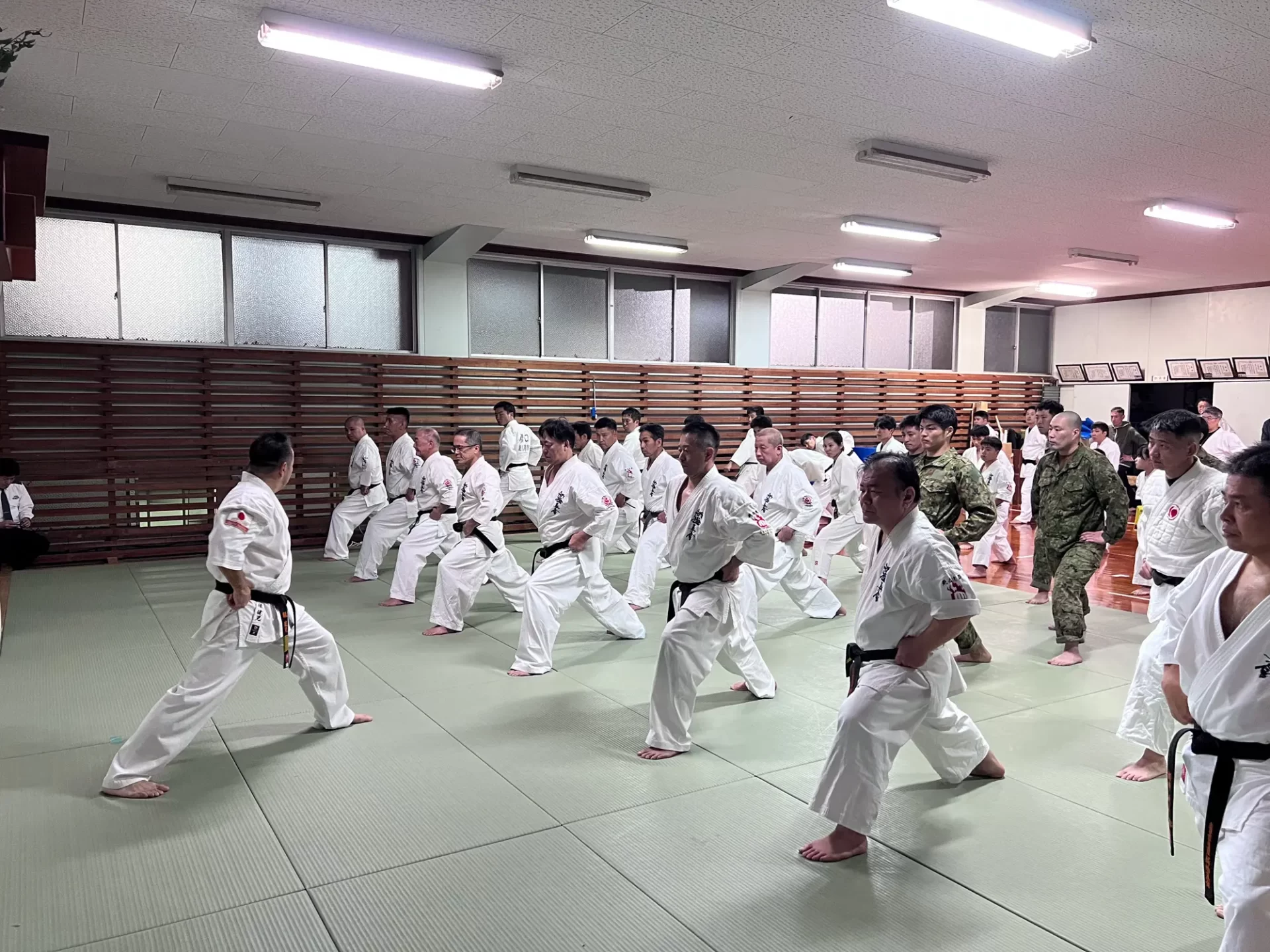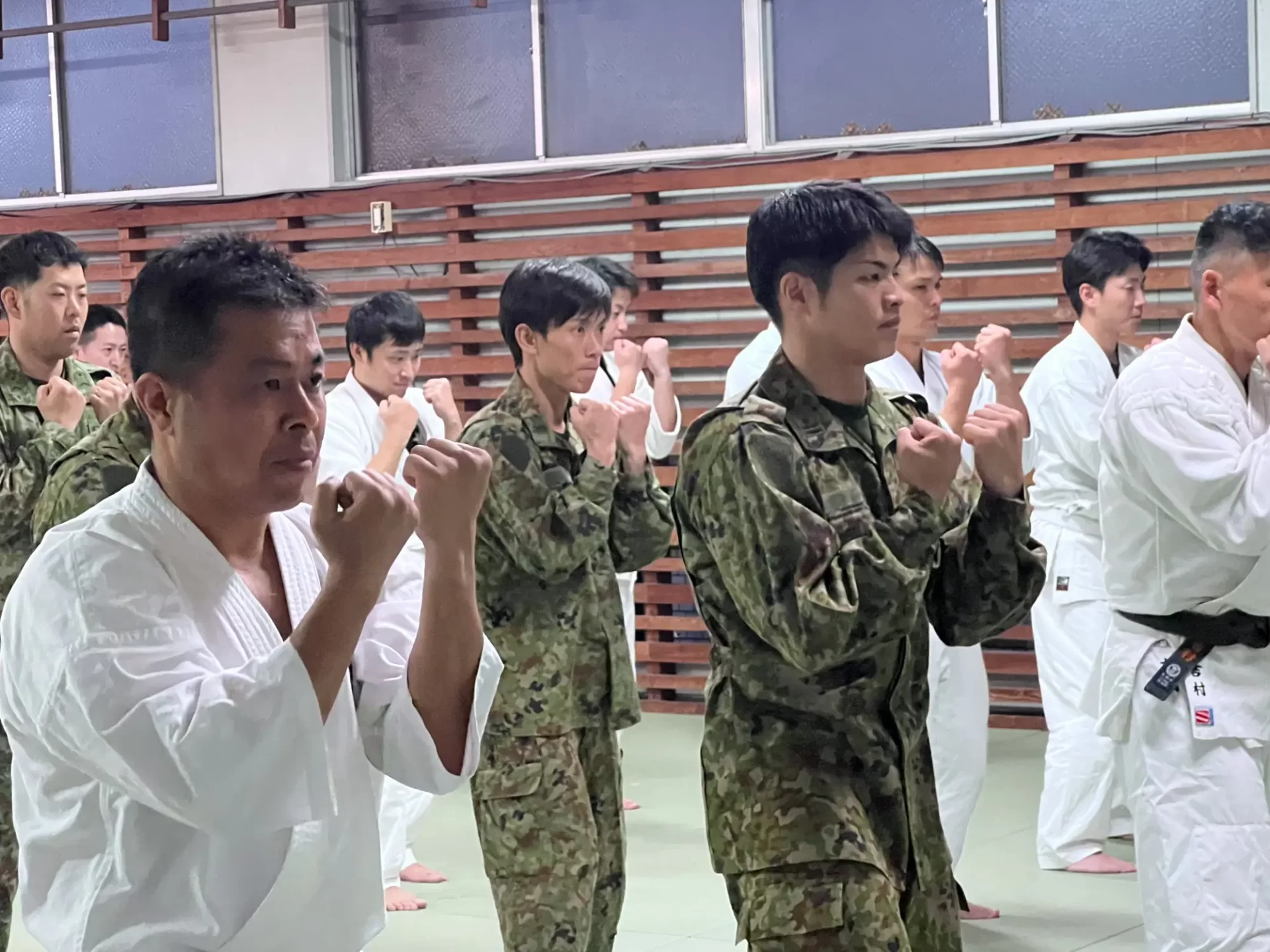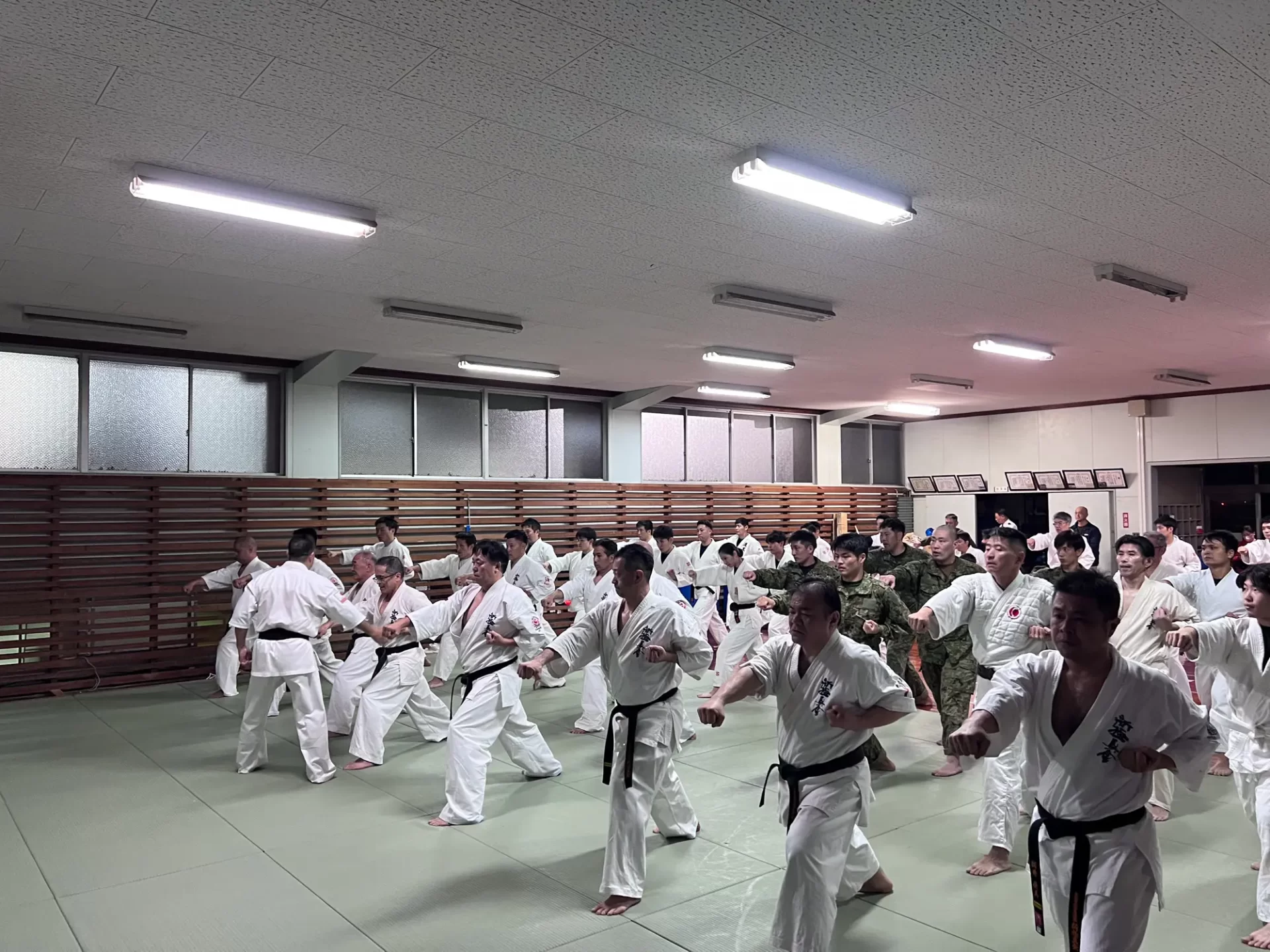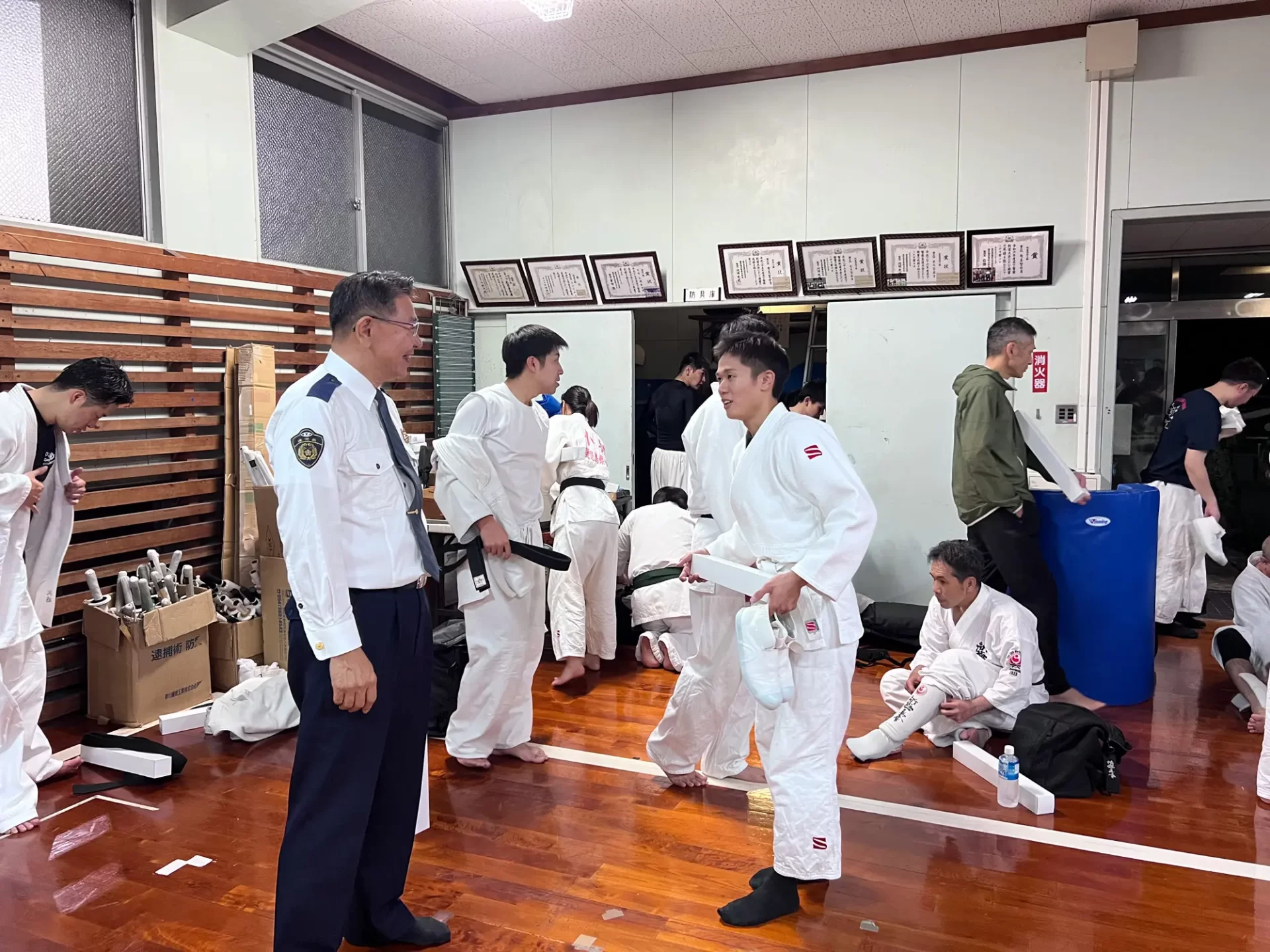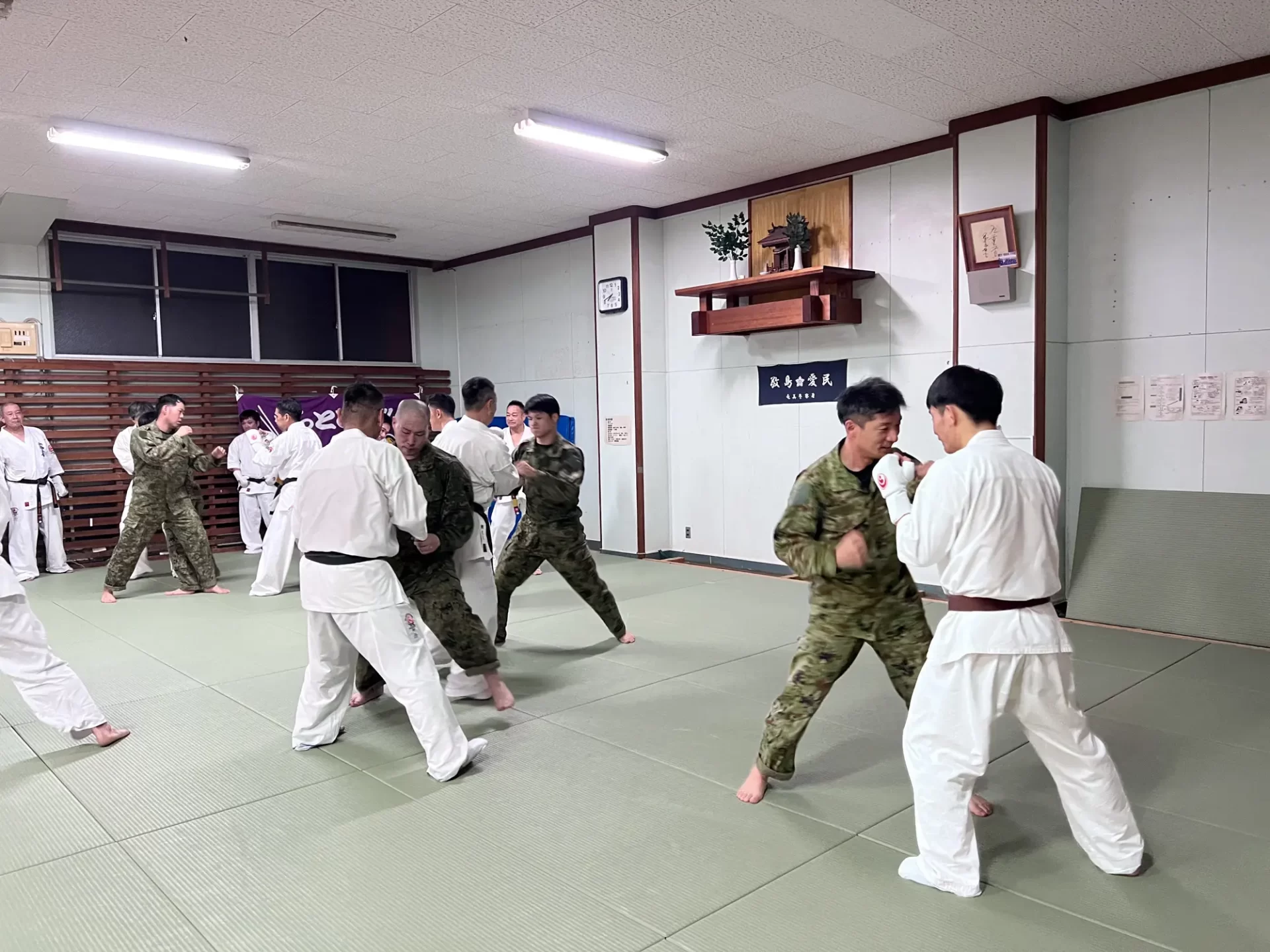 道場生にとって普段触れあうことのない警察署員、陸上自衛隊員、海上保安部 職員との交流が行われるとともに、子供たちの声の大きさや元気良い立ち振る 舞い、シニア道場生の歳を感じさせない動き、そして道場生全体のスタミナに驚きを隠せない職員の顔が印象的でした。