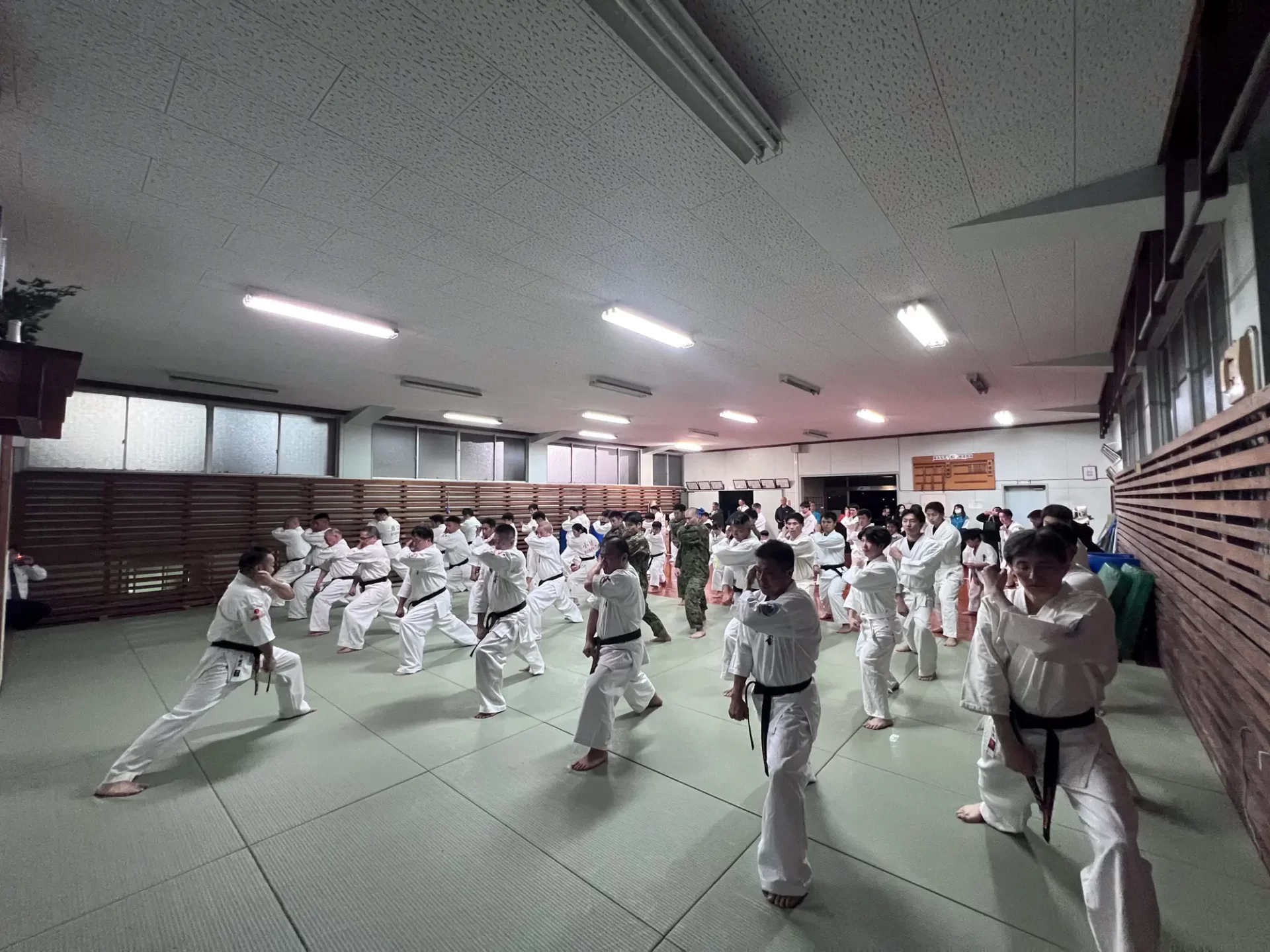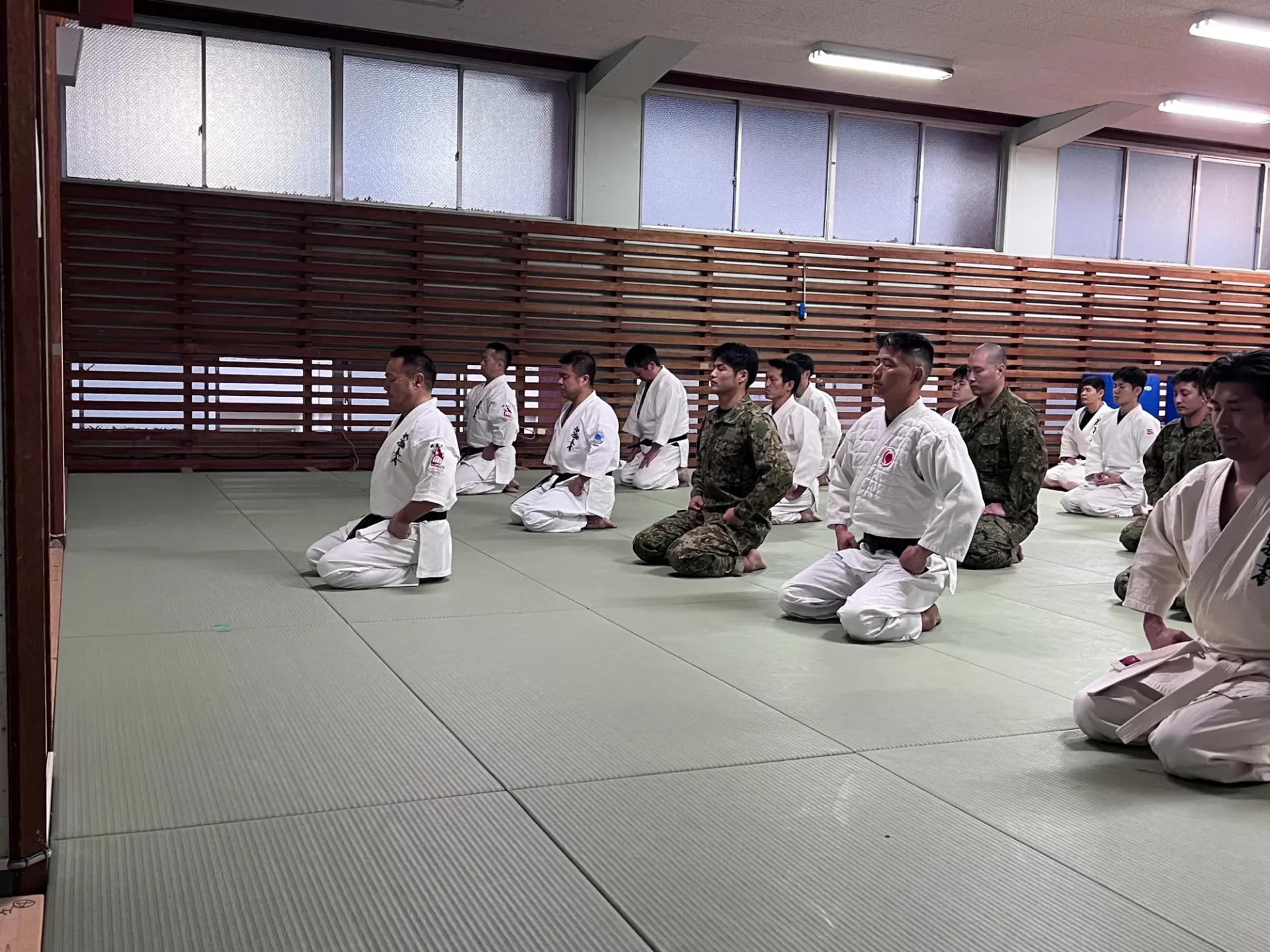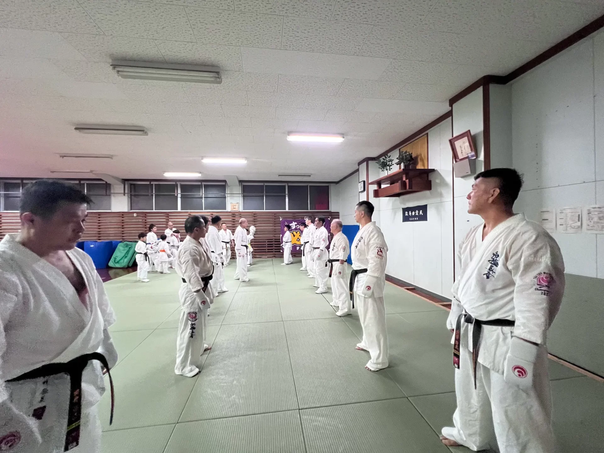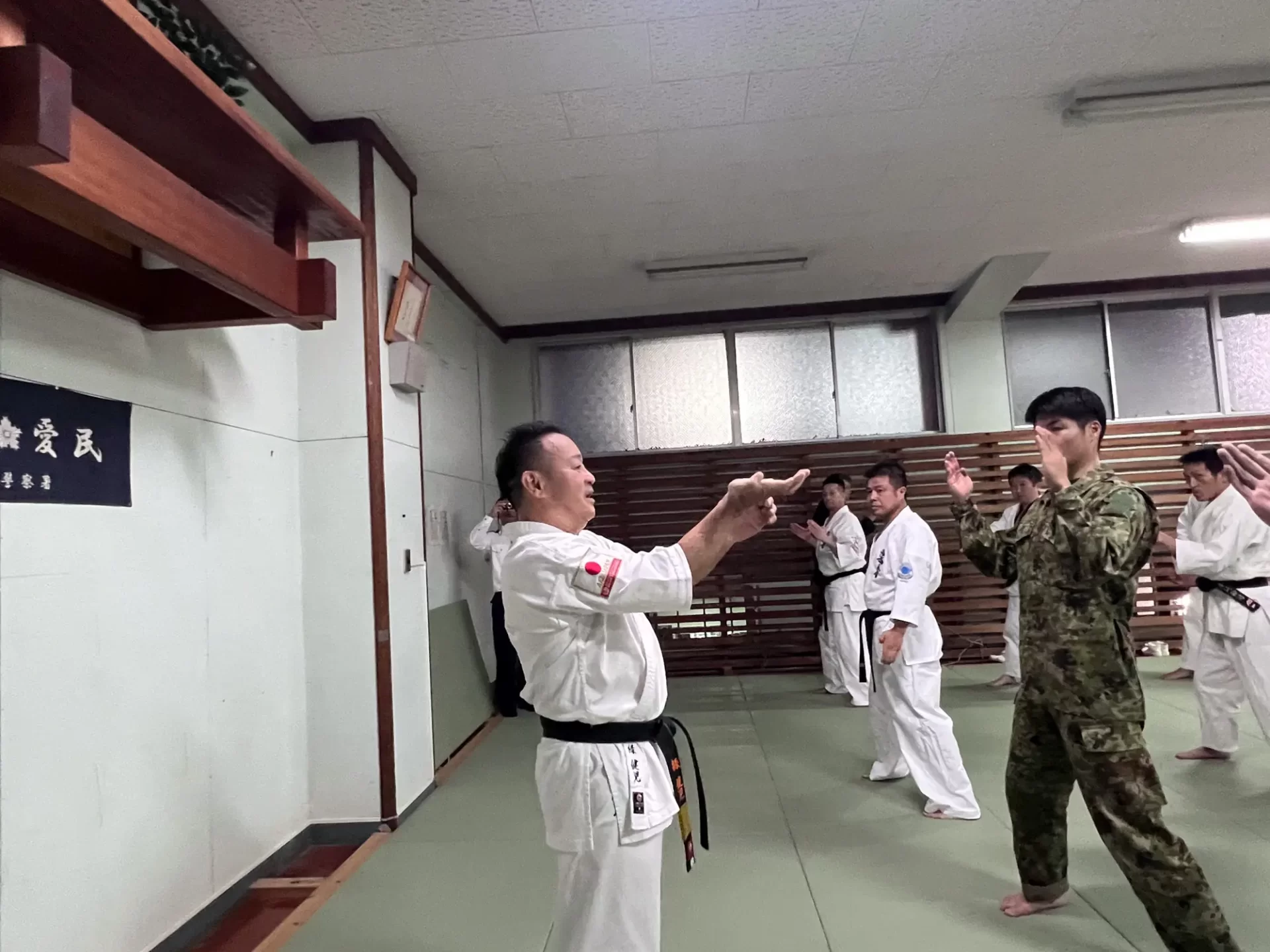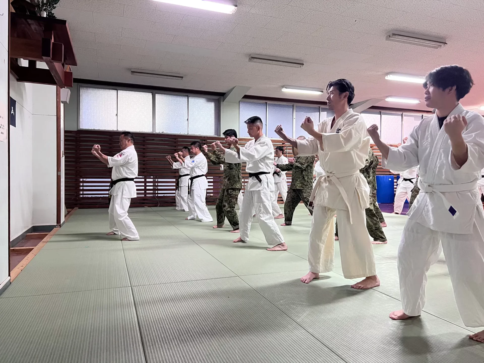 道場生にとって普段触れあうことのない警察署員、陸上自衛隊員、海上保安部 職員との交流が行われるとともに、子供たちの声の大きさや元気良い立ち振る 舞い、シニア道場生の歳を感じさせない動き、そして道場生全体のスタミナに驚きを隠せない職員の顔が印象的でした。