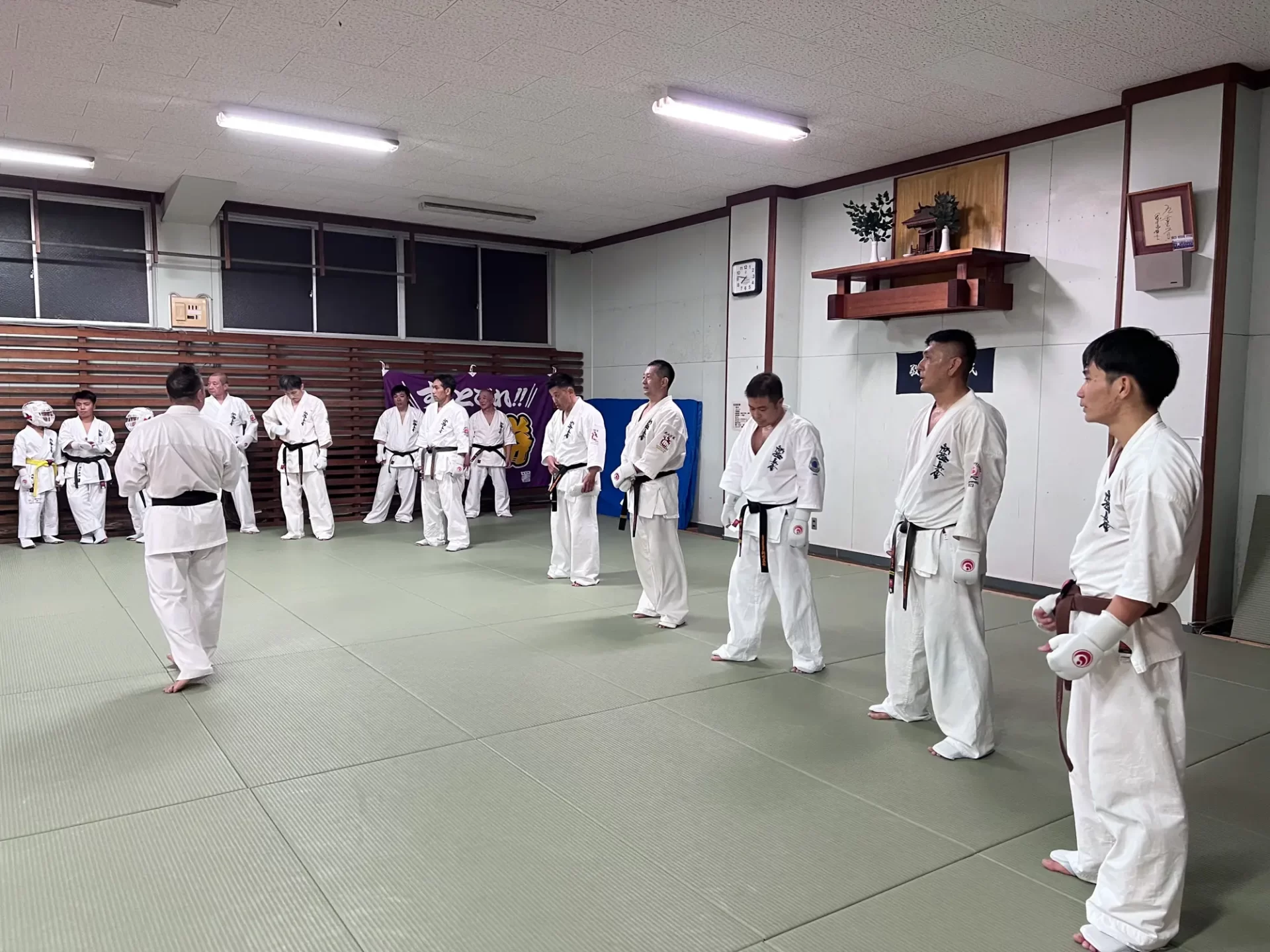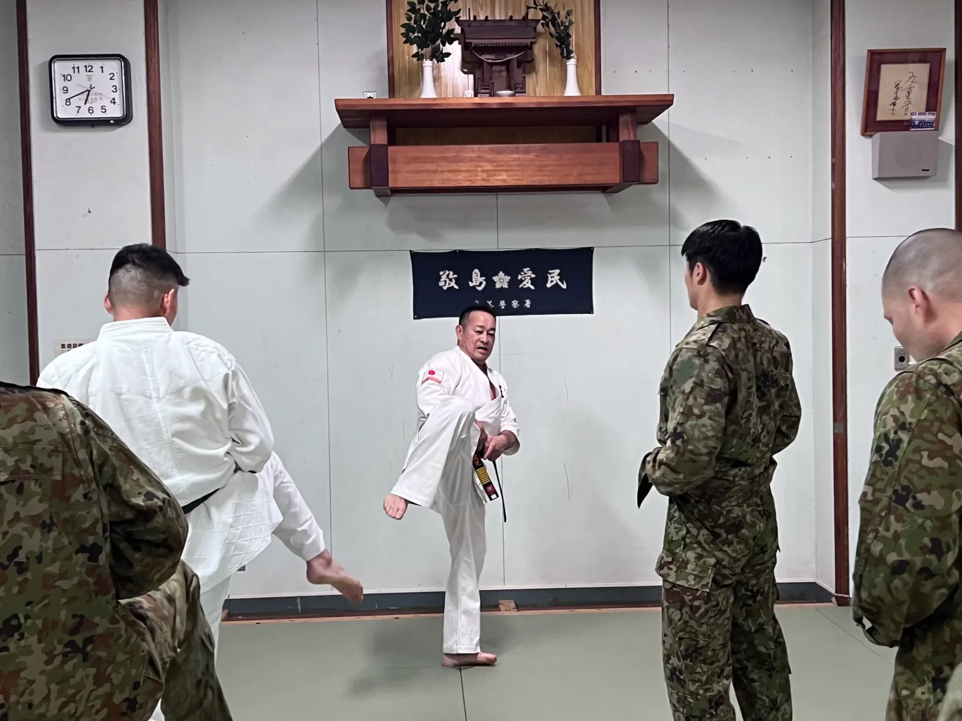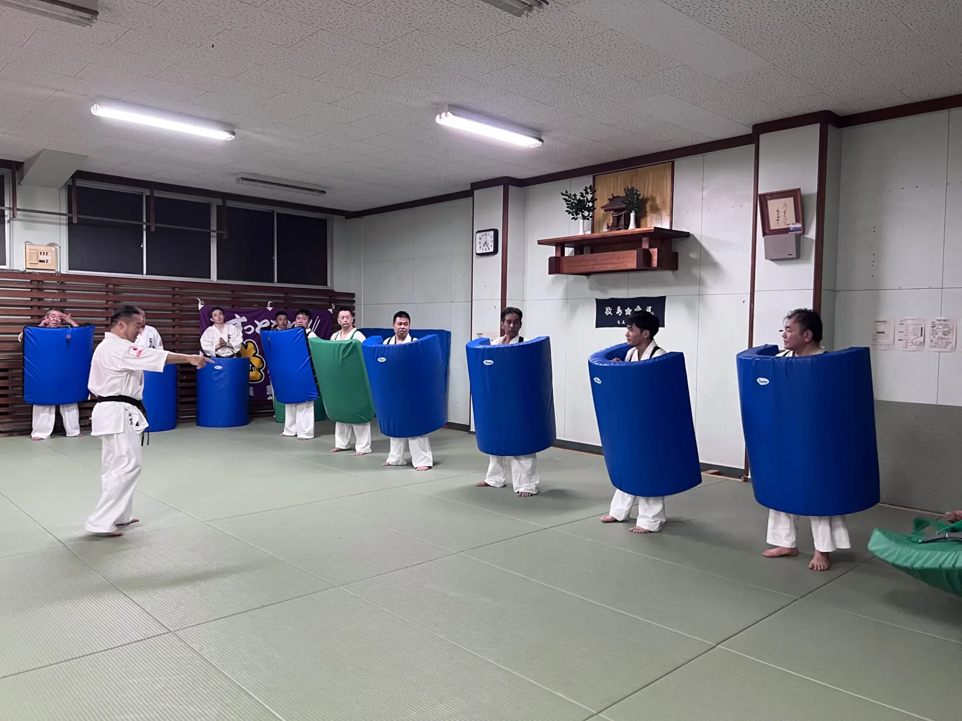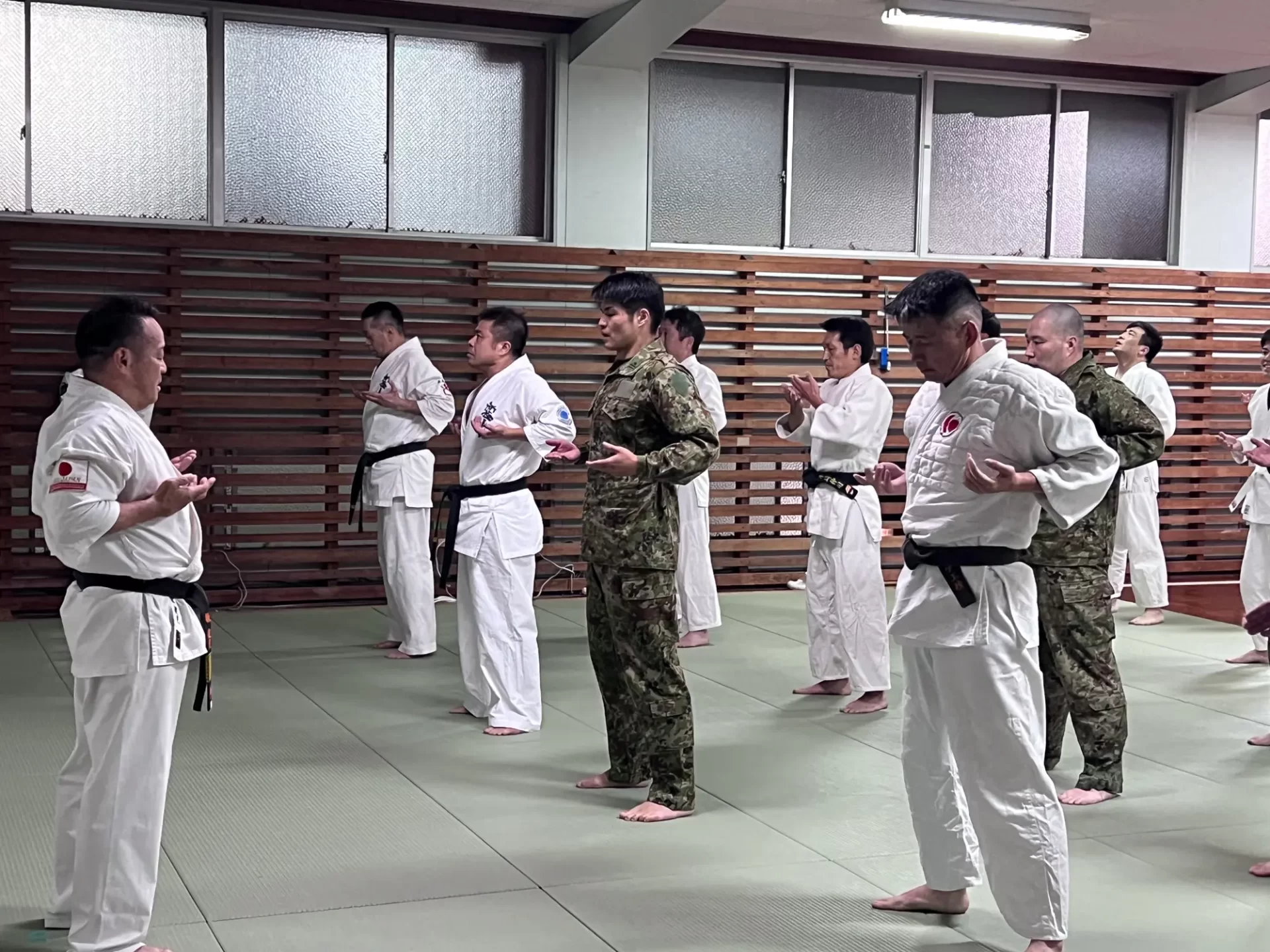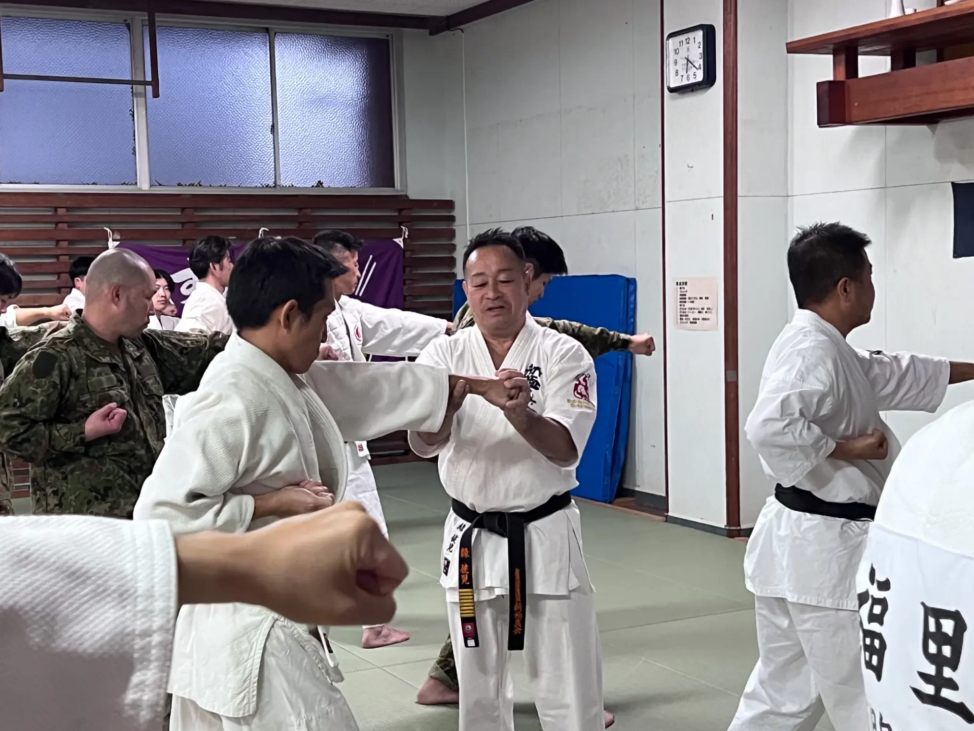 道場生にとって普段触れあうことのない警察署員、陸上自衛隊員、海上保安部 職員との交流が行われるとともに、子供たちの声の大きさや元気良い立ち振る 舞い、シニア道場生の歳を感じさせない動き、そして道場生全体のスタミナに驚きを隠せない職員の顔が印象的でした。
