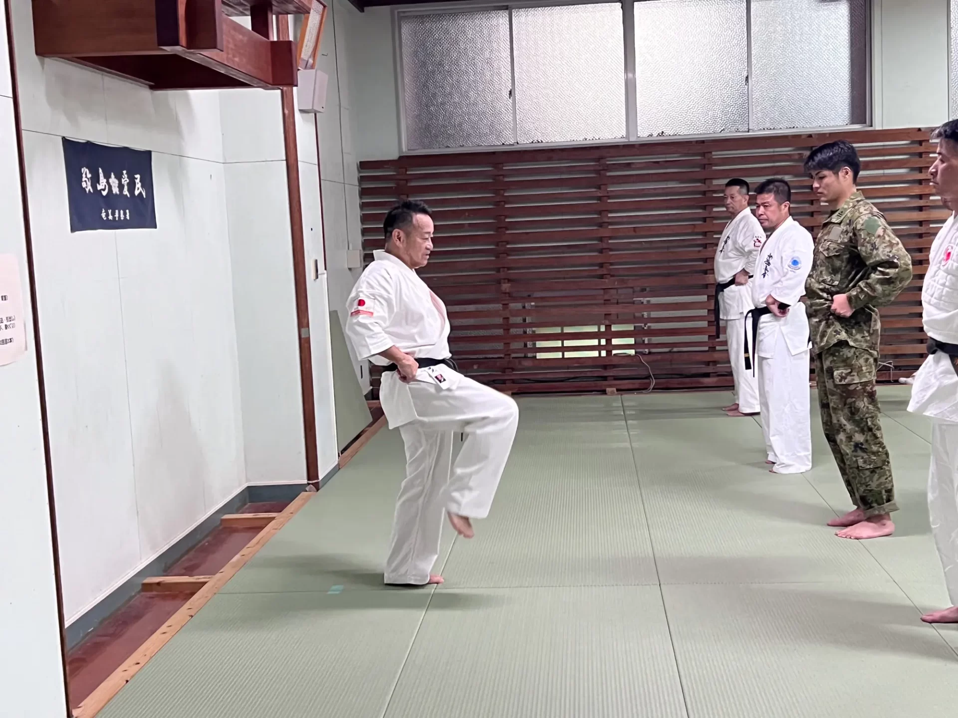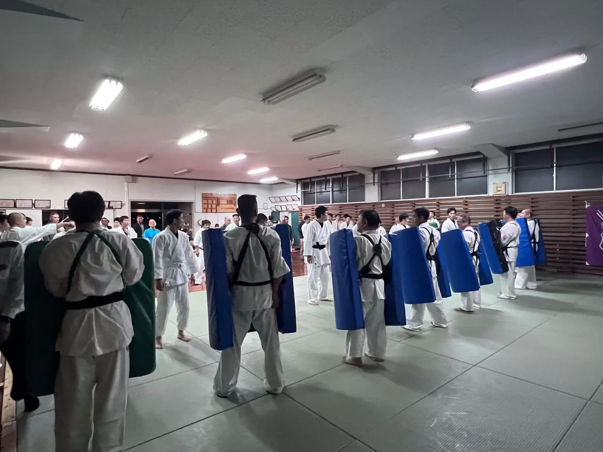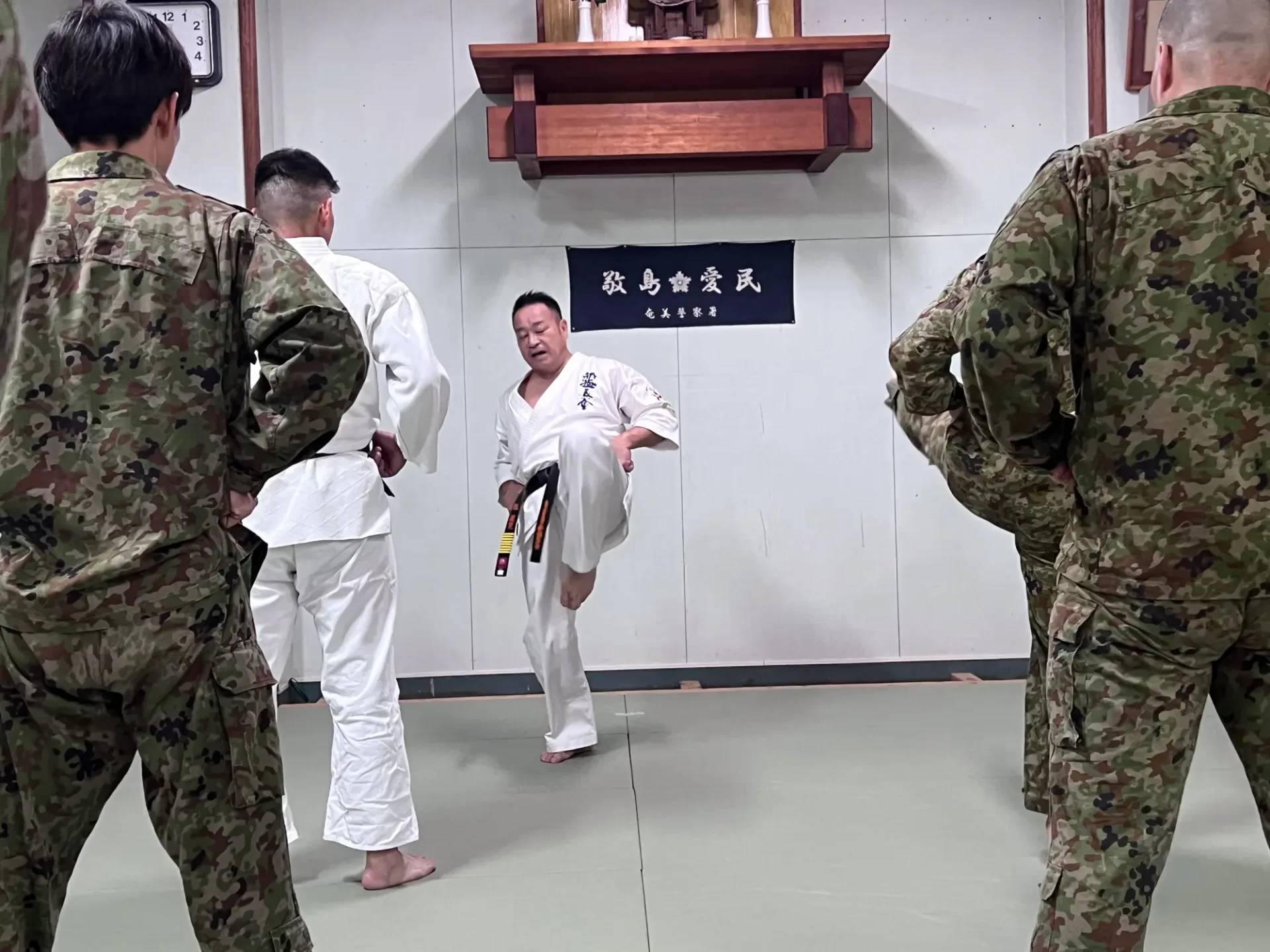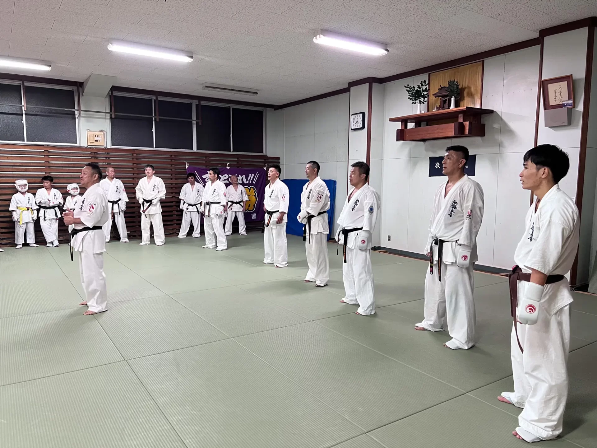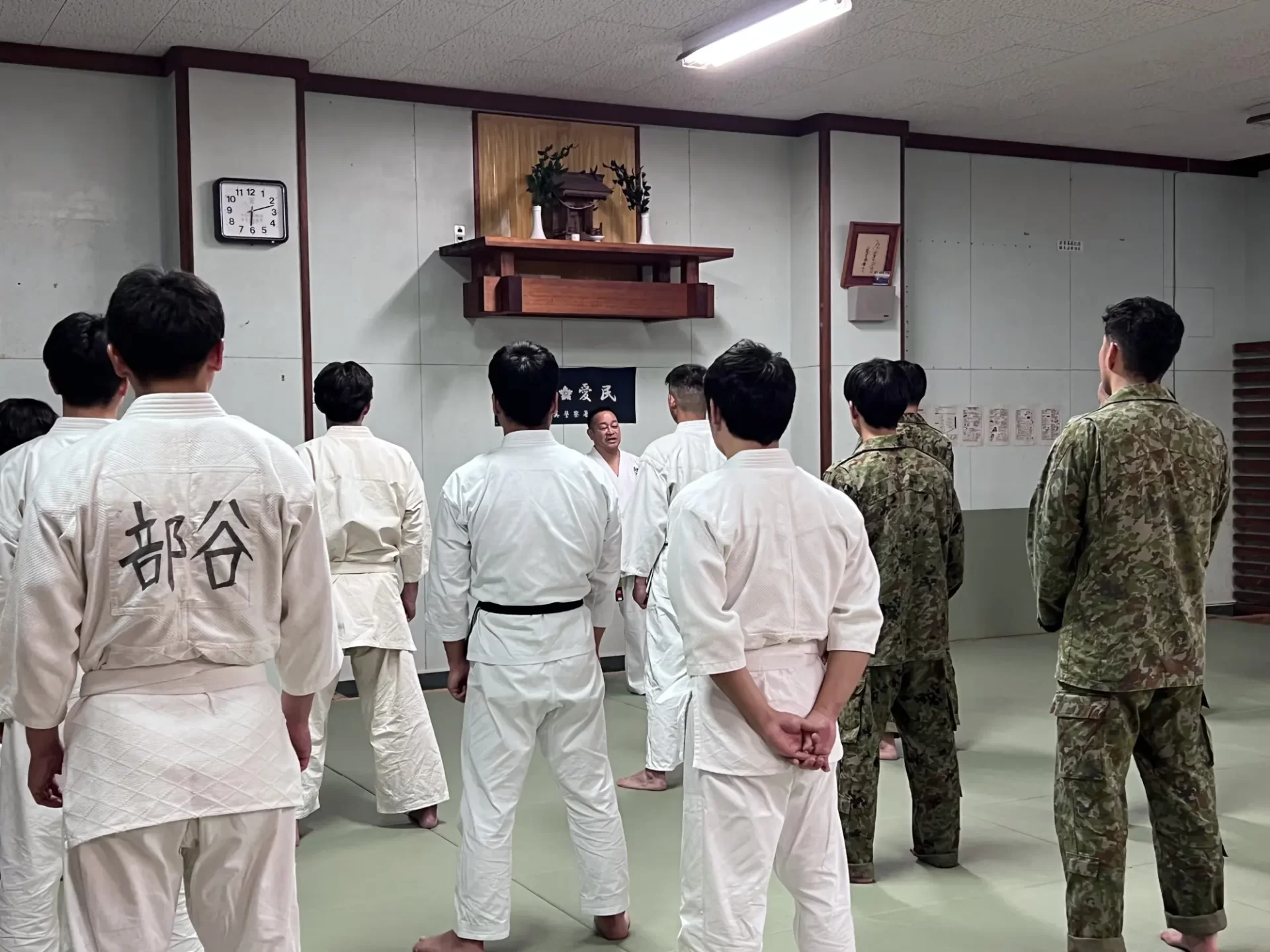 道場生にとって普段触れあうことのない警察署員、陸上自衛隊員、海上保安部 職員との交流が行われるとともに、子供たちの声の大きさや元気良い立ち振る 舞い、シニア道場生の歳を感じさせない動き、そして道場生全体のスタミナに驚きを隠せない職員の顔が印象的でした。