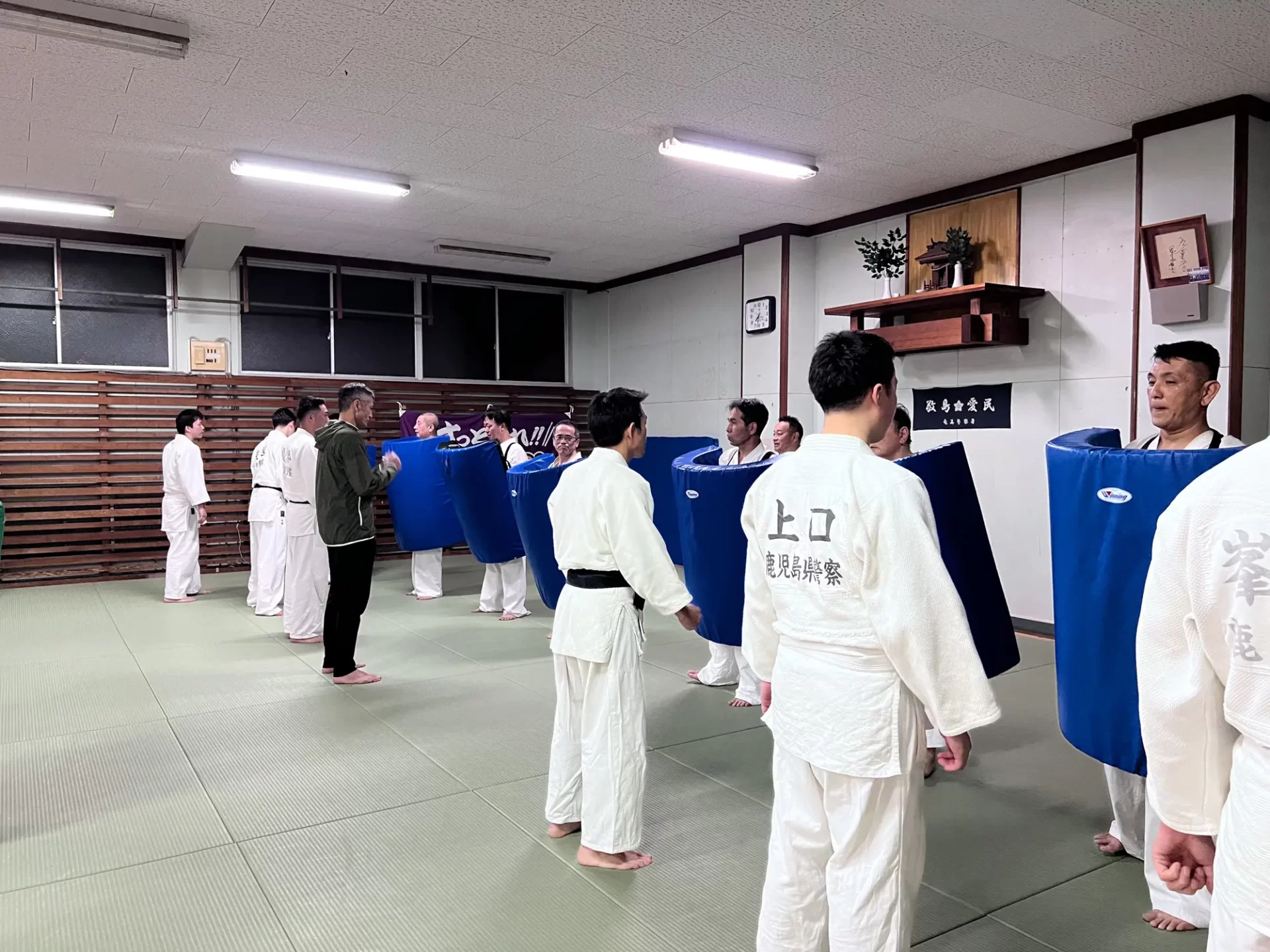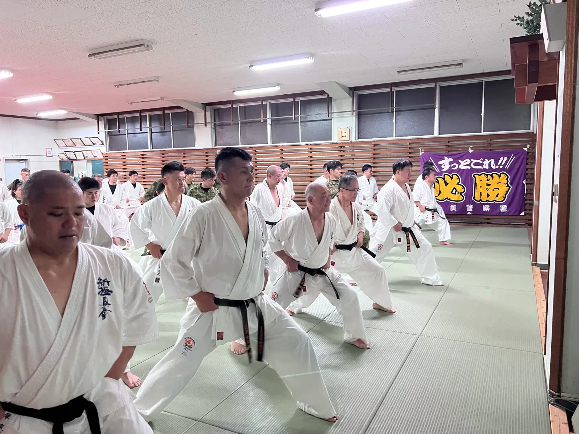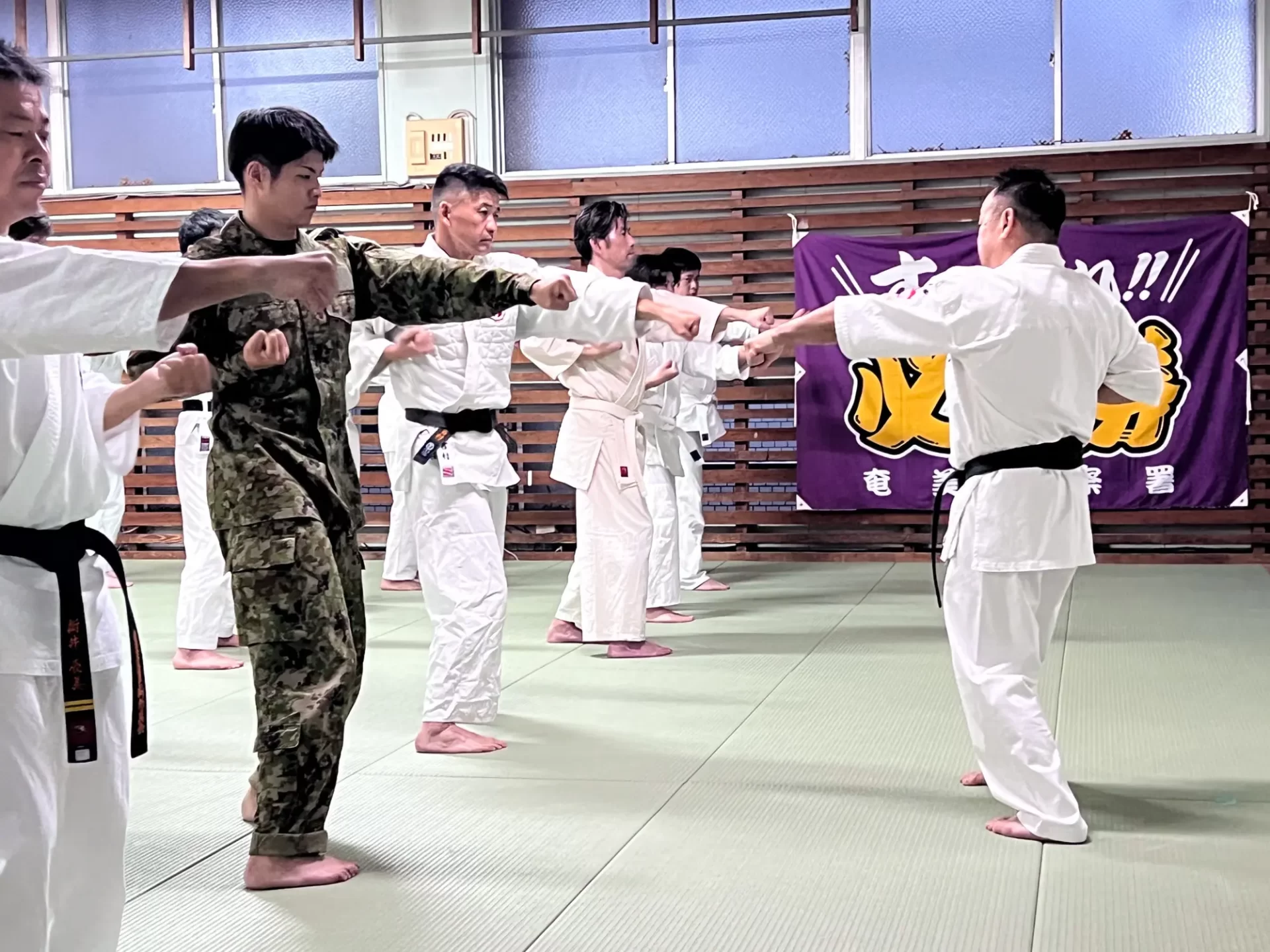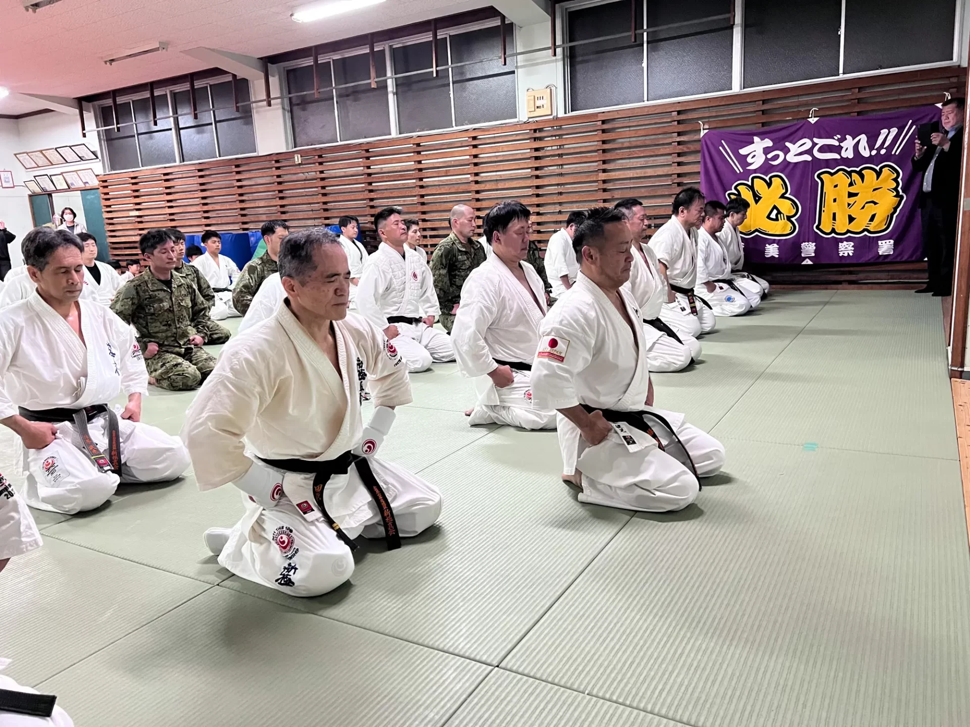 この合同稽古は、奄美大島の安全安心を守る関係機関が一同に介してそれぞ れの機関が保有する逮捕術や制圧技について、 必要最小限度の実力行使による 制圧技を訓練し、関係機関の連携強化を図ることと、 緑健児代表のふるさとであ るこの奄美の地で根付いている新極真カラテをそれぞれの職員が習い、触れる ことで、職員の心身及び体力の強化を図り、 島民や島を訪れる方々への平穏な生 活に寄与することを目的として行われました。