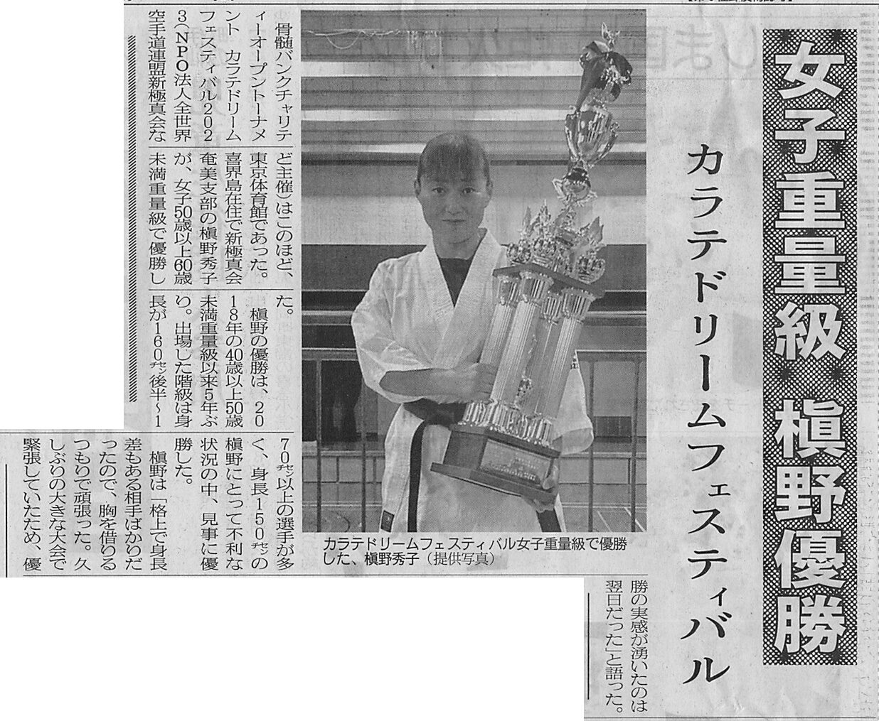 地元新聞掲載記事 2023 8/02 メディア 2023年8月1日2023年8月2日 2023年7月22日、23日東京体育館にて開催されました、「カラテドリームフェスティバル2023全国大会」で優勝した槇野さんが2023年7月30日奄美新聞さんで記事として掲載されました。 提供:株式会社奄美新聞社 メディア よかったらシェアしてね! URLをコピーしました! URLをコピーしました! カラテドリームフェスティバル2023全国大会 結果 極論〜コトバの組手〜 関連記事 第33回オープントーナメント佐賀筑後空手道選手権大会 新聞掲載記事 2025年4月11日 奄美大島で合同稽古が開催されました! 2025年2月18日 第11回オープントーナメント鹿児島県空手道選手権大会 新聞掲載記事 2024年12月22日 第1回空手Champion of Champions 新聞記事 2024年8月8日 新時代のスター誕生!「第1回空手Champion of Champions」 2024年8月6日 カラテドリームフェスティバル 2024年8月2日 空手 Champion of Champions テレビ放映 2024年7月27日 Champion of Champions 2024年7月13日
