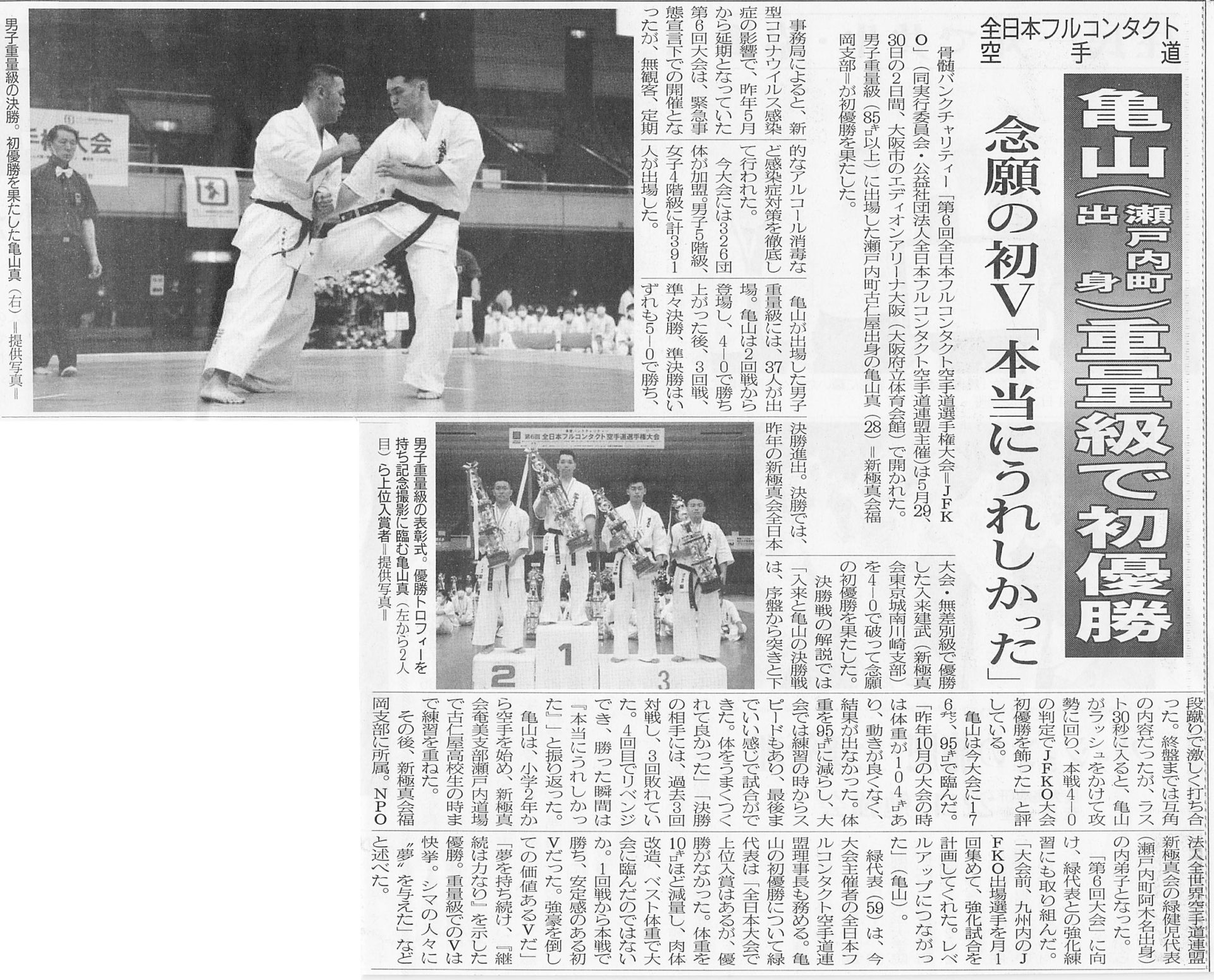 亀山選手重量級で初優勝 2021 6/05 お知らせ 2021年6月5日 5月29日、30日に開催された「第6回全日本フルコンタクト空手道選手権大会」にて、瀬戸内町出身の亀山真選手が重量級で初優勝しました。 お知らせ よかったらシェアしてね! URLをコピーしました! URLをコピーしました! 2021年春季昇級審査会結果 スポーツ報知WEBサイト記事 関連記事 「緑健児代表のAI」を体験してみませんか 2025年12月5日 喜界島道場 グランドゴルフ大会 2025年11月28日 大阪・関西万博演武会 2025年10月2日 奄美勢が大活躍 2025年8月26日 2025年なぜまち商店街夏祭り 2025年8月9日 緑代表著書『強く 優しく 世界を目指せ』を、徳之島の三町へ寄贈 2025年8月7日 新極真会奄美支部・龍郷道場の道場開き 2025年7月1日 強く 優しく 世界をめざせ: あきらめなければ夢は叶う 2025年5月17日